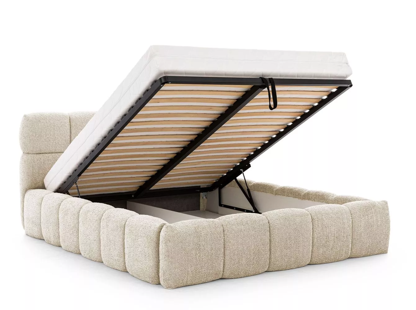 Manželská čalouněná postel 200x200 ZOUZETE se hodí do moderních pokojů či ložnic. Čelo postele slouží jako opora zad, která zajišťuje pohodlný odpočinek vsedě, pokud si například chcete v posteli číst knihu nebo vypít ranní kávu. Úložný prostor je otevíraný z boku.