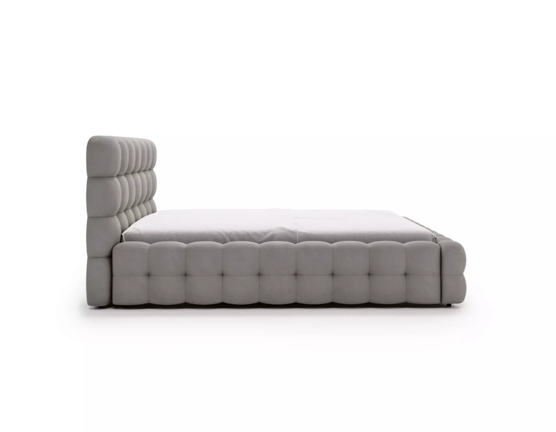Manželská postel 200x200 MAFALDA na první pohled zaujme svým neobvyklým designem. Vysoké čalouněné čelo zamezí poškrábání a zašpinění zdi.
