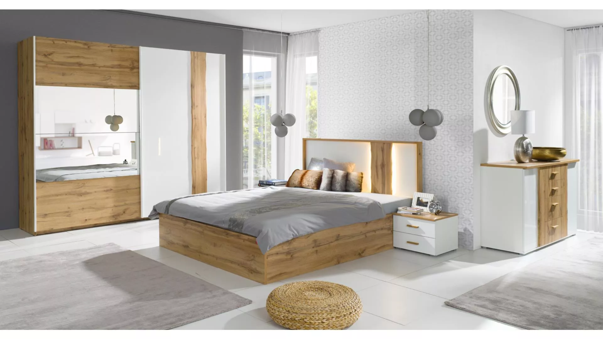 Dopřejte si klidné večery s postelí GARZON plnou pohodlí a stylu. Vysoké čelo s integrovaným LED osvětlením vytvoří příjemnou atmosféru a pohodlné opření při relaxaci. Kombinace dubu wotan a bílého lesku dodá ložnici teplý a moderní nádech.