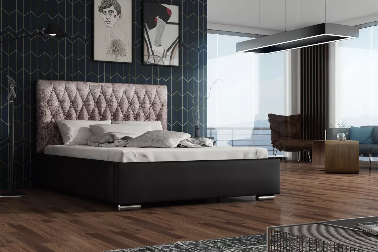 Manželská postel 140x200 SIRENA 1 s prošívaným čelem a zdobeným knoflíky se stane dominantou každého prostoru. Boky postele jsou potaženy černou eko kůží. Kovové stříbrné nožičky dodávají posteli atraktivní design.