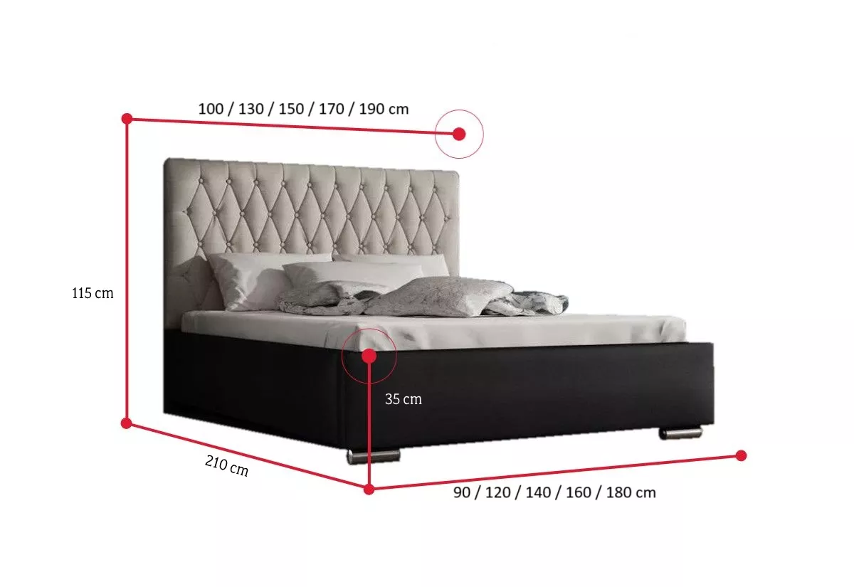 Manželská postel 160x200 SIRENA 1 s prošívaným čelem a zdobeným knoflíky se stane dominantou každého prostoru. Boky postele jsou potaženy černou eko kůží. Kovové stříbrné nožičky dodávají posteli atraktivní design.