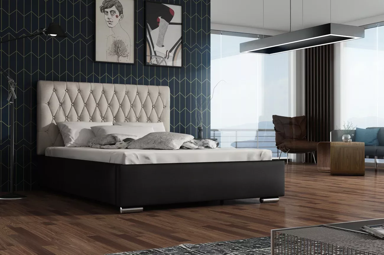 Manželská postel 180x200 SIRENA 1 s prošívaným čelem a zdobeným knoflíky se stane dominantou každého prostoru. Boky postele jsou potaženy černou eko kůží. Kovové stříbrné nožičky dodávají posteli atraktivní design.