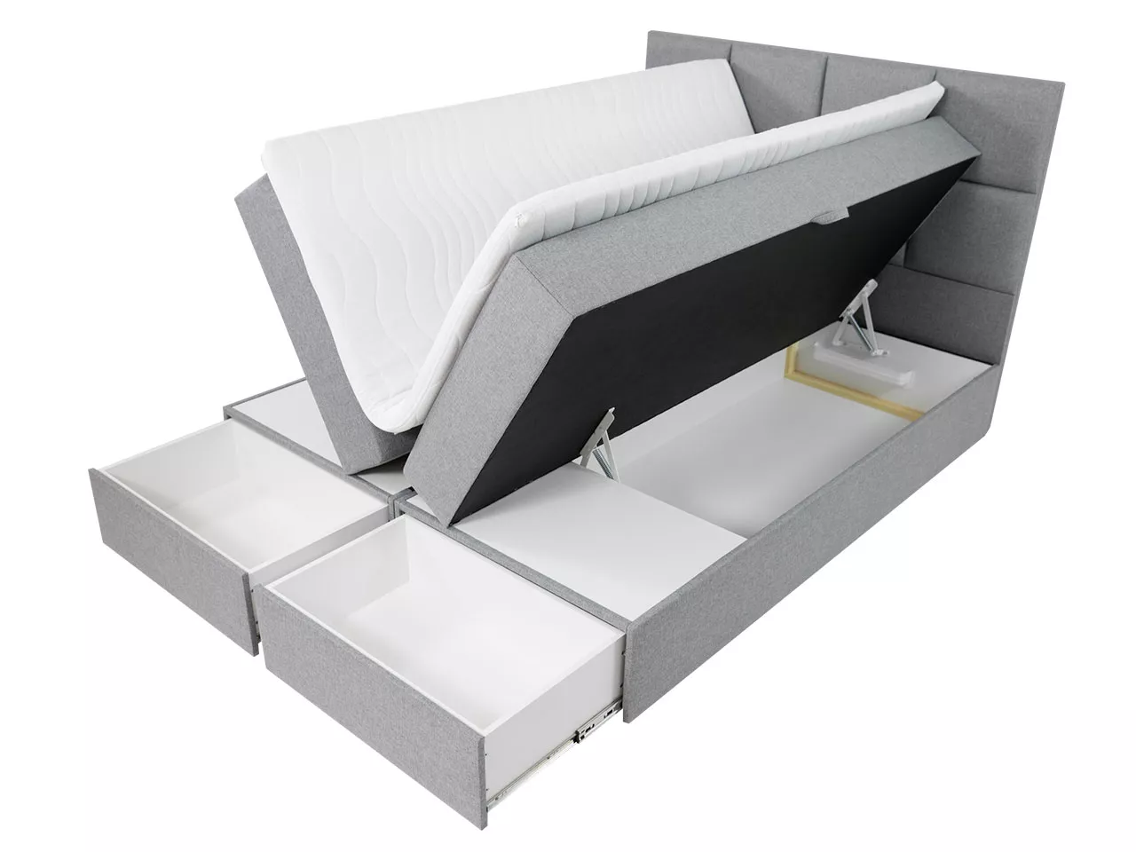 Manželská boxpringová postel s vysokým čelem LUGAU se vyznačuje pohodlím, praktičností a důrazem na detail. Postel o spací ploše 200x200 cm tvoří komfortní taštičková matrace a horní topper pro maximální pocit pohodlí. Výklopný úložný prostor na lůžkoviny umístěný z obou stran postele doplňují 2 praktické výsuvné šuplíky.