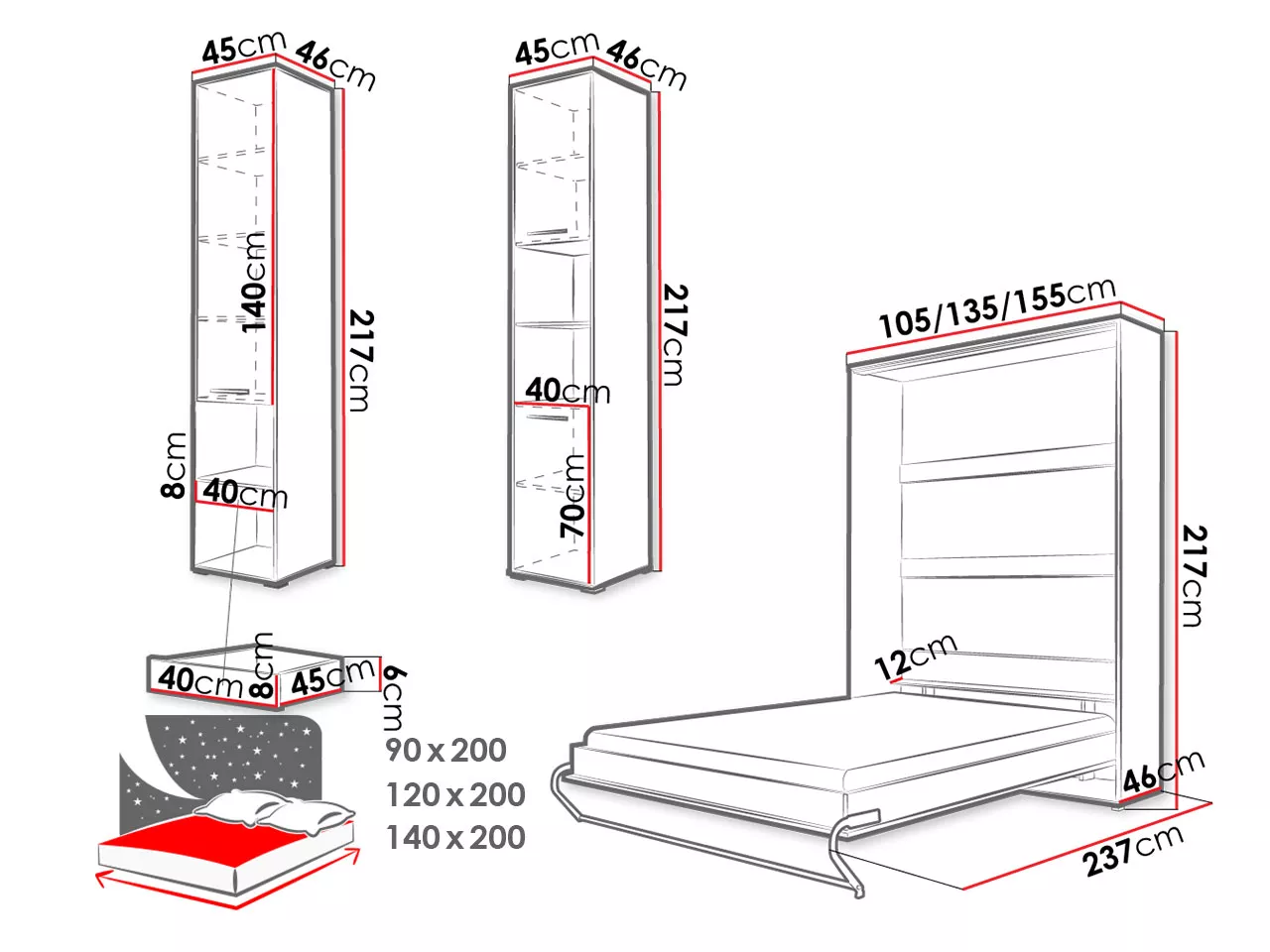Vertikální výklopná manželská postel CELENA o spací ploše 140x200 cm je inovativním řešením do menších místností či garsonek, kde kombinuje funkčnost, jednoduchost použití a univerzální design. Postel je dodávána se 2 skříňkami, které poskytují velké množství úložného prostoru pro ložní prádlo či oblečení. Během pár vteřin proměníte obývací či dětský pokoj v ložnici, a naopak díky bezpečnému mechanismu.