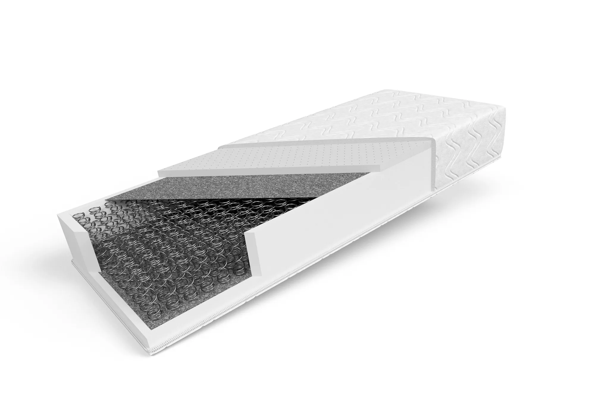 Pružinová latexová matrace 140x200 GRANITE je v jádru tvořená kvalitním systémem bonelových pružin, PUR pěnou a latexem. Vysokou výhodou pružinových matraci je jejich životnost, pevná konstrukce a vysoká vzdušnost. Latex má antialergické vlastnosti a poskytuje dostatečnou prodyšnost a dobrou oporu těla.