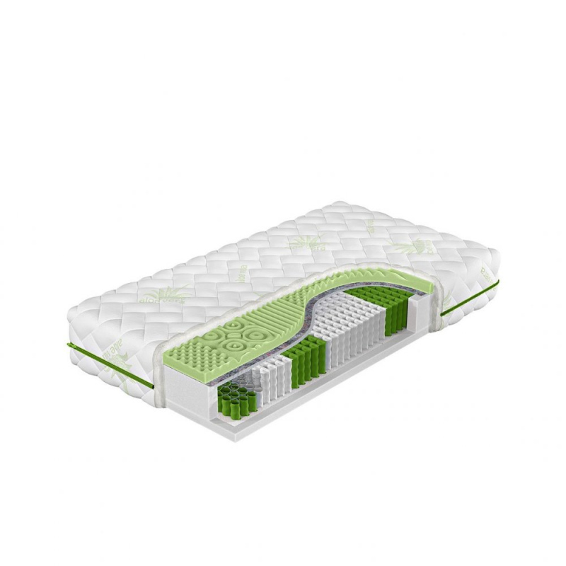 Matrace FRISCO 1 je vybavena střední tvrdostí, což vám zaručí větší pohodlí během spánku. Vícevrstvá konstrukce, vysoce kvalitní komponenty a pečlivě promyšlený design poskytují ideální podmínky pro regenerační odpočinek. Jádro matrace tvoří taštičkové pružiny, které jsou stabilně podepřeny pěnovými boky. Při každodenním používání matrace jsou zodpovědné za vícebodový systém podpory těla umístěného na povrchu. Přizpůsobení matrace přirozenému zakřivení páteře je prospěšné pro zdravý spánek. Kromě pružin se matrace skládá také z několika druhů pěn, včetně masážní pěny se zvýšenou tuhostí. Antimikrobiální izolace odděluje matraci od potahu, což podporuje hygienu vašeho spánku i samotné matrace. Potah matrace je zase vyroben z prodyšné a pevné tkaniny. Navíc je vyztužen klimatizačním vláknem.