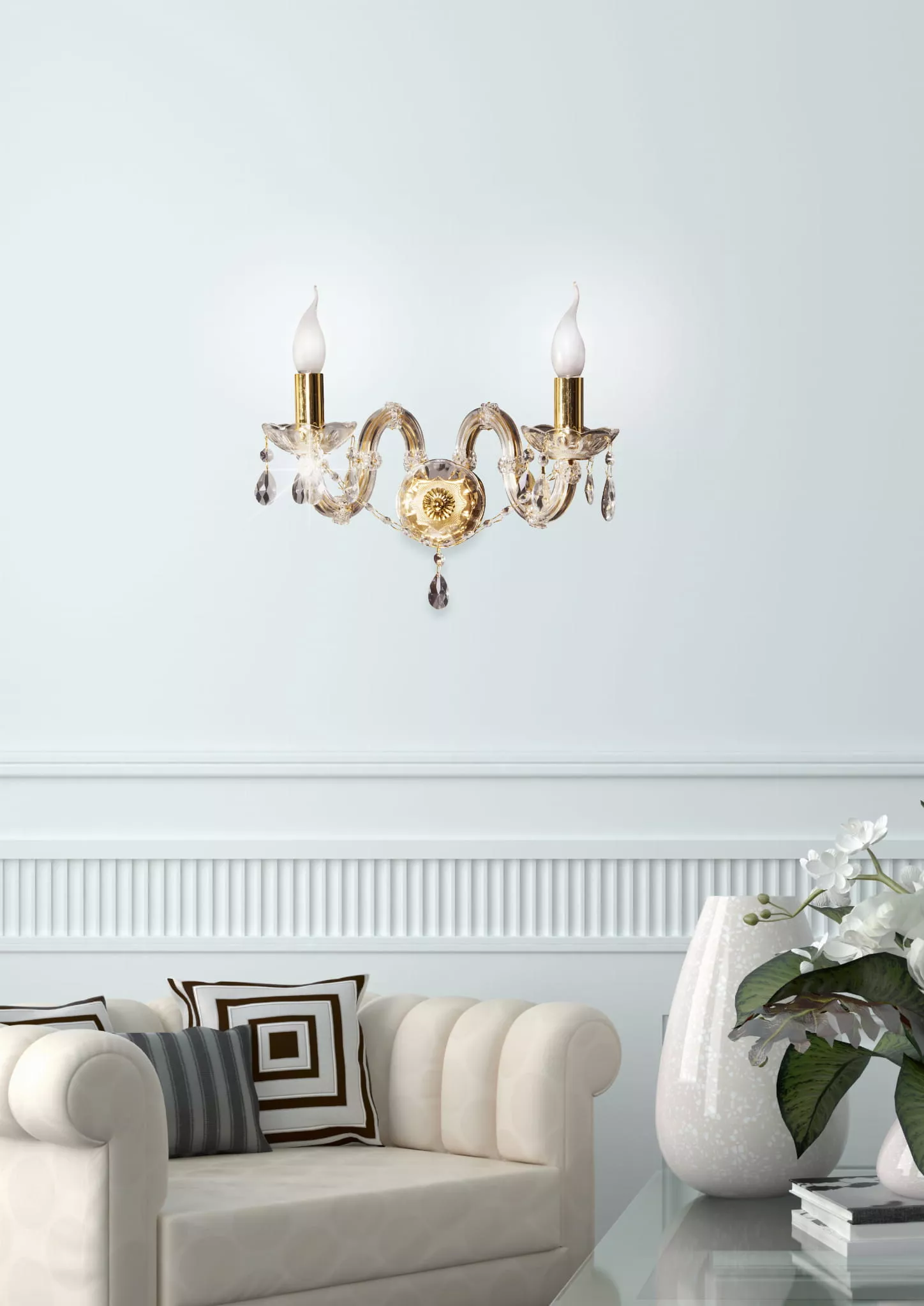 Nástěnné svítidlo MARIA TERESA je klasické a honosné svítidlo, které evokuje dojem křišťálového lustru a dodává interiéru nádech barokní elegance. Svítidlo v lesklém zlatém provedení je typické pro slavnostní prostory. Je dekorováno malými plastovými krystalky, které po rozsvícení vytvářejí třpytivý a rozptýlený světelný efekt. Je ideální jako doplňkové osvětlení do obývacích pokojů, hal nebo ložnic v tradičním stylu. Je určeno pro 2 žárovky s paticí E14 a maximálním výkonem 40 W. Pro úsporu el. energie doporučujeme osadit úspornou LED žárovkou. Krytí IP20 značí vhodnost použití v interiéru.