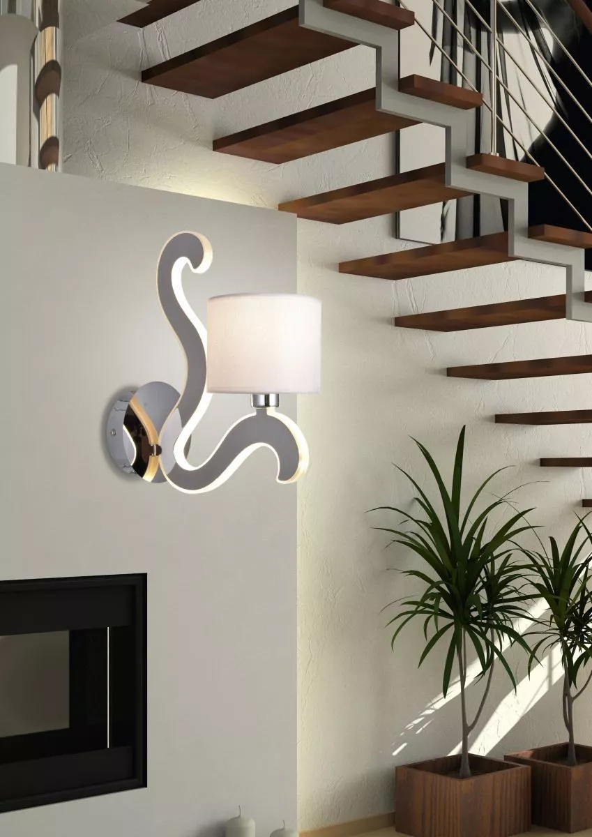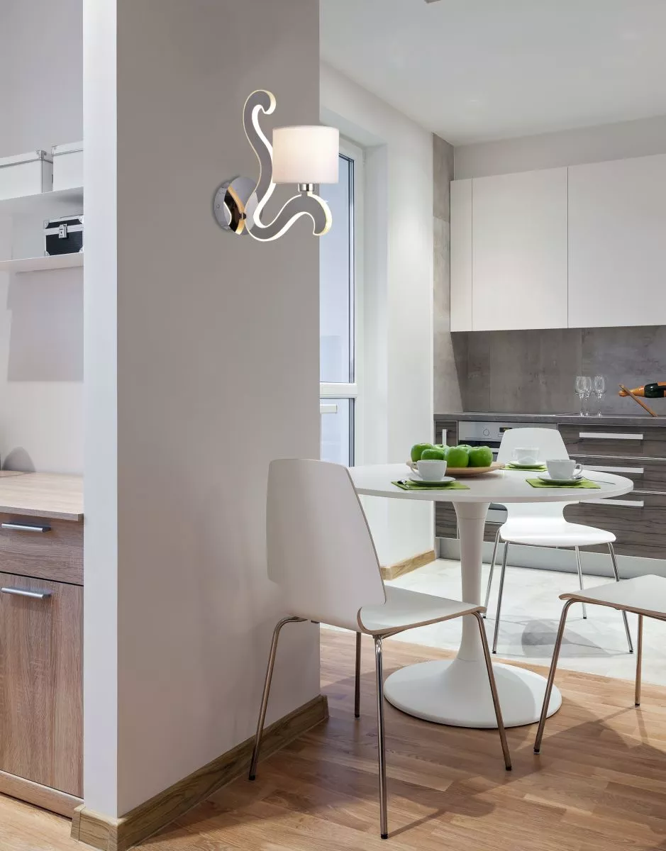 Vneste do svého domova výjimečný světelný prvek s nástěnnou lampou AMBROSIA, jejíž chromovaná kovová konstrukce s elegantně tvarovanými rameny doplňuje bílé textilní stínidlo a vytváří skutečně originální dojem. Integrovaná 6 W LED dioda skrytá v ramenech svítí současně s hlavním světlem na žárovku E14, takže lampu oceníte v obývacím pokoji i ložnici jako příjemné doplňkové osvětlení s teplým nádechem. Hlavní světlo je určeno pro žárovku s paticí E14 a maximálním výkonem 40 W, LED modul je součástí a má odstín teplé bílé 2800 K. Krytí IP20 značí vhodnost použití v interiéru.