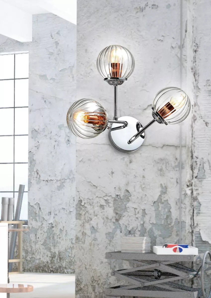 Vytvořte svému domovu moderní nádech s nástěnným osvětlením BEST! Chromovaná konstrukce zajímavého tvaru je doplněná 3 průhlednými stínidly s jemným dekorem, čímž vzniká čistý a elegantní vzhled. Hodí se do předsíně, chodby nebo obývacího pokoje jako stylové doplňkové světlo. Určeno pro 3 žárovky s paticí E14 a maximálním výkonem 40 W. Pro úsporu el. energie doporučujeme osadit úspornou LED žárovkou. Krytí IP20 značí vhodnost použití v interiéru.