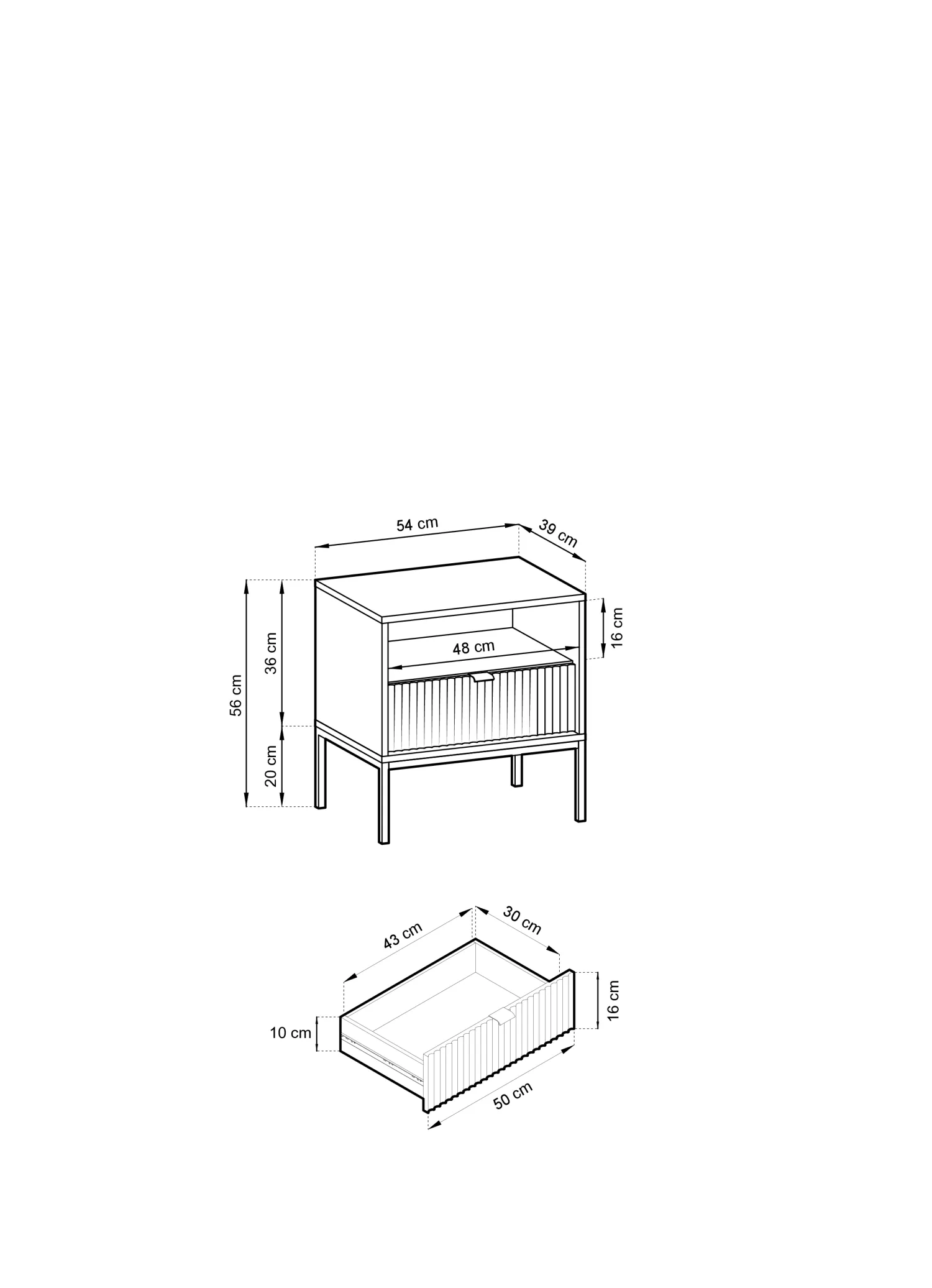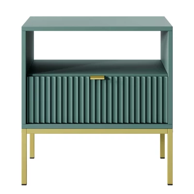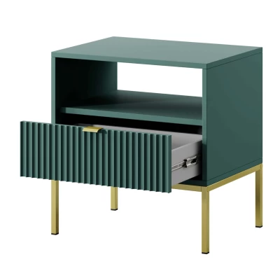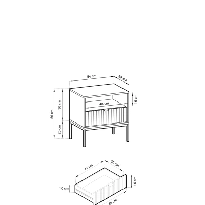 Noční stolek MISHEEL se vyznačuje zásuvkou s 3D texturou a jednoduchým hliníkovým úchytem. Stolek je kromě šuplíku vybaven i otevřenou policí, na kterou si můžeme odkládat rozečtenou knihu. Konstrukce stolku je založena na stabilním kovovém rámu.