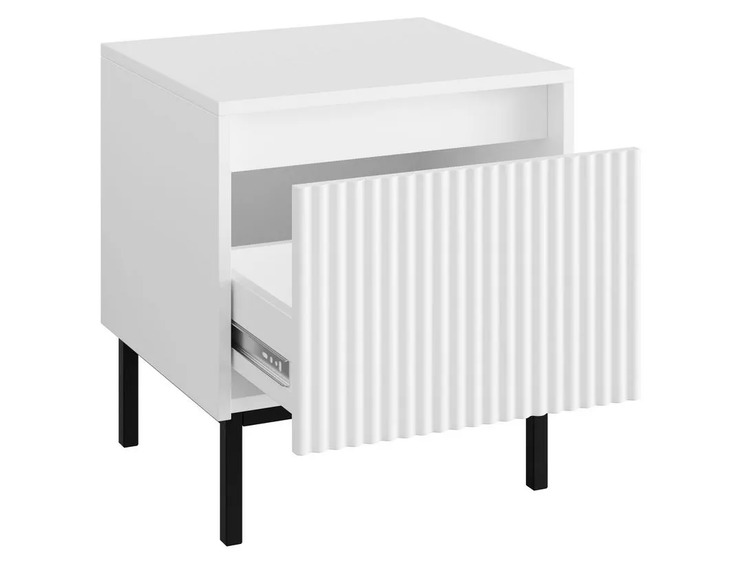 Noční stolek REMY zdůrazní nejen jedinečný charakter interiéru, ale přinese i mnoho výhod při každodenním používání. Prostorná zásuvka vám umožní schovat drobnosti a zároveň udržet v ložnici pořádek. Jedinečný design stolku podtrhují vysoké kovové nožky v černé barvě a frézování na čele zásuvky.