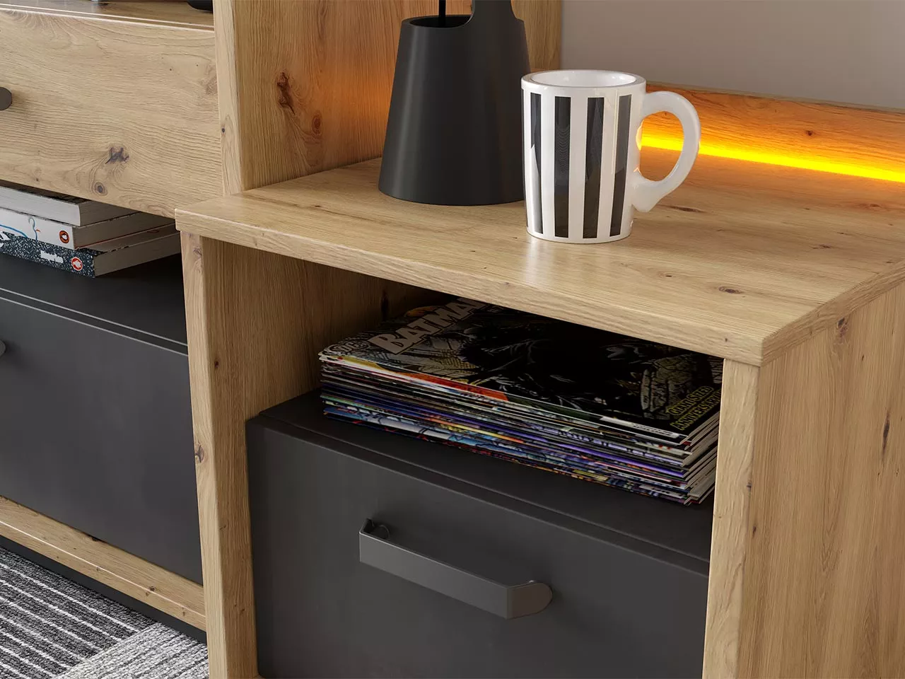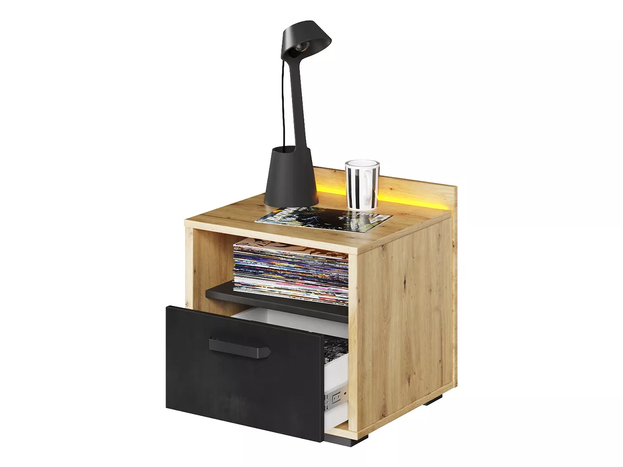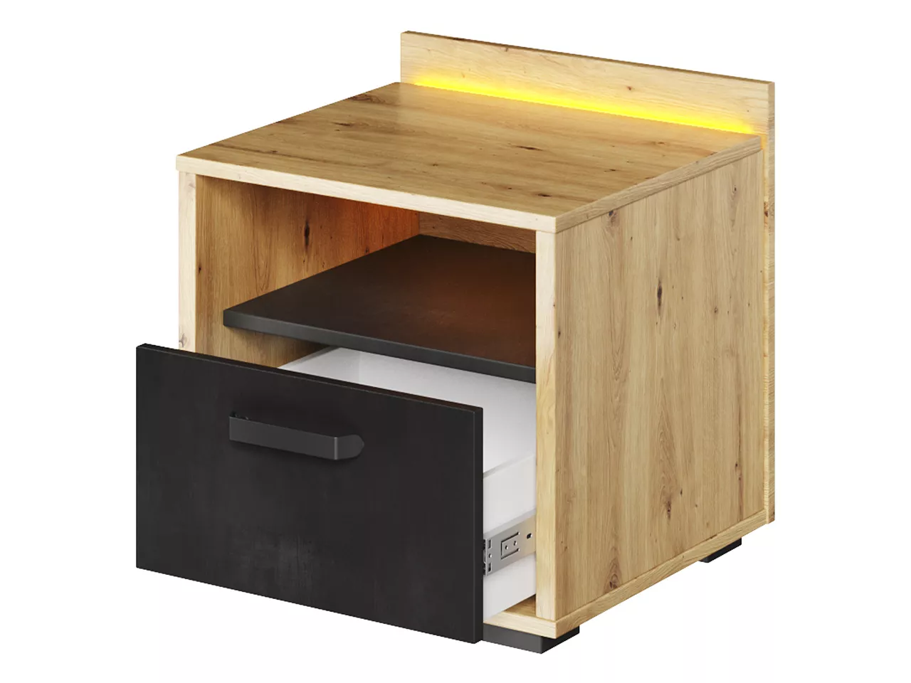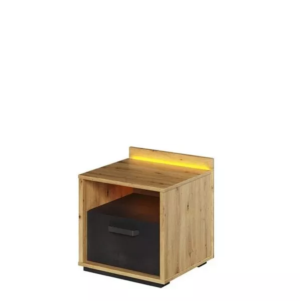 Noční stolek APTOS je jak praktickým, tak estetickým doplňkem každého studentského pokoje. Pomáhá udržet místnost uklizenou tím, že nabízí snadno dostupné místo na odkládání věcí. Další předností nočního stolku je LED osvětlení, které do interiéru navodí útulnou atmosféru.