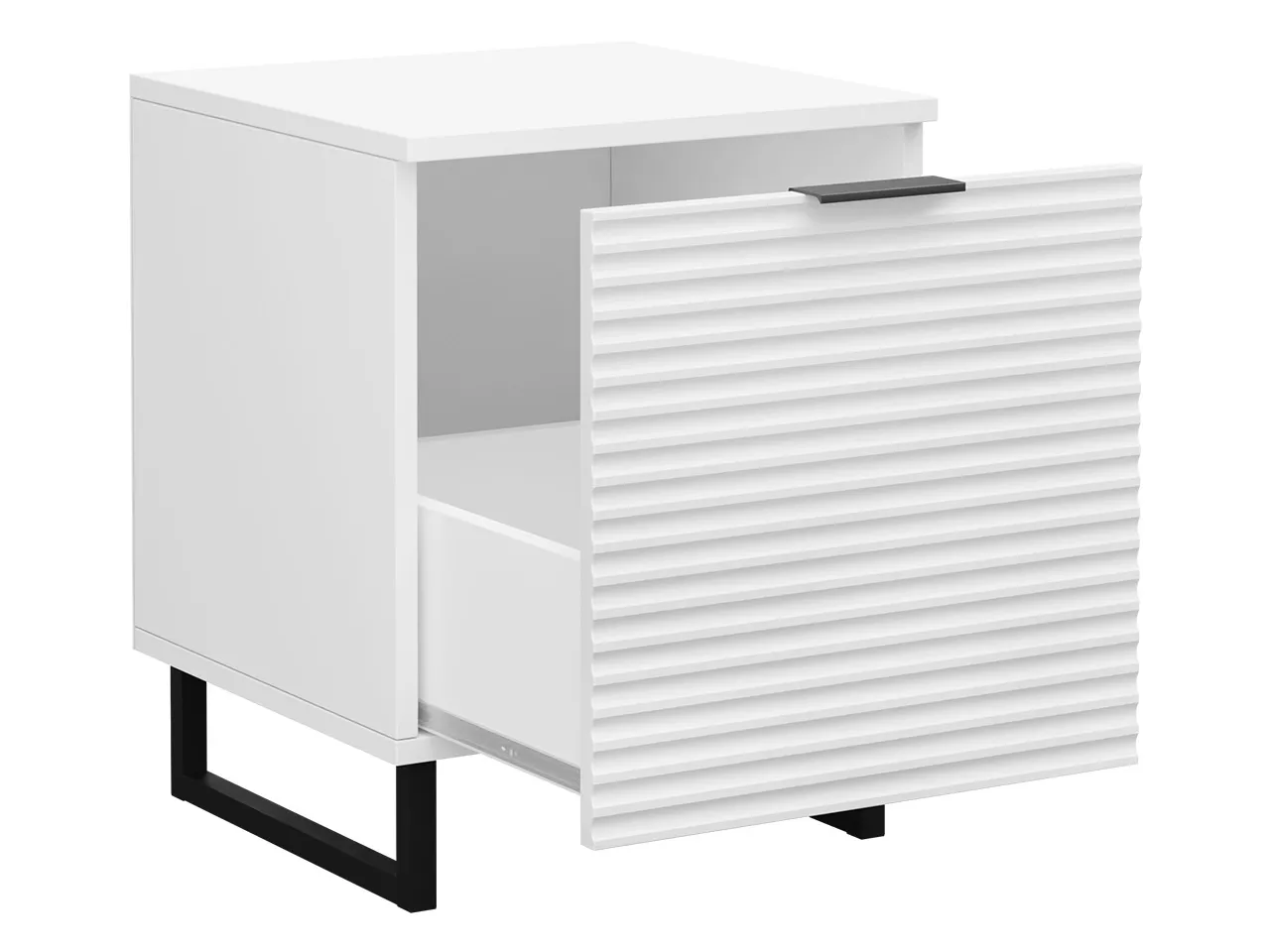 Stolek k posteli OVERTON je vybaven šikovnou hlubokou zásuvkou. Vyznačuje se drážkovanými čely a geometrickými nohami a skvěle se hodí do moderních, klasických i loftových interiérů. Vysoké kovové nohy poskytují pevnou oporu a usnadňují udržování pořádku.