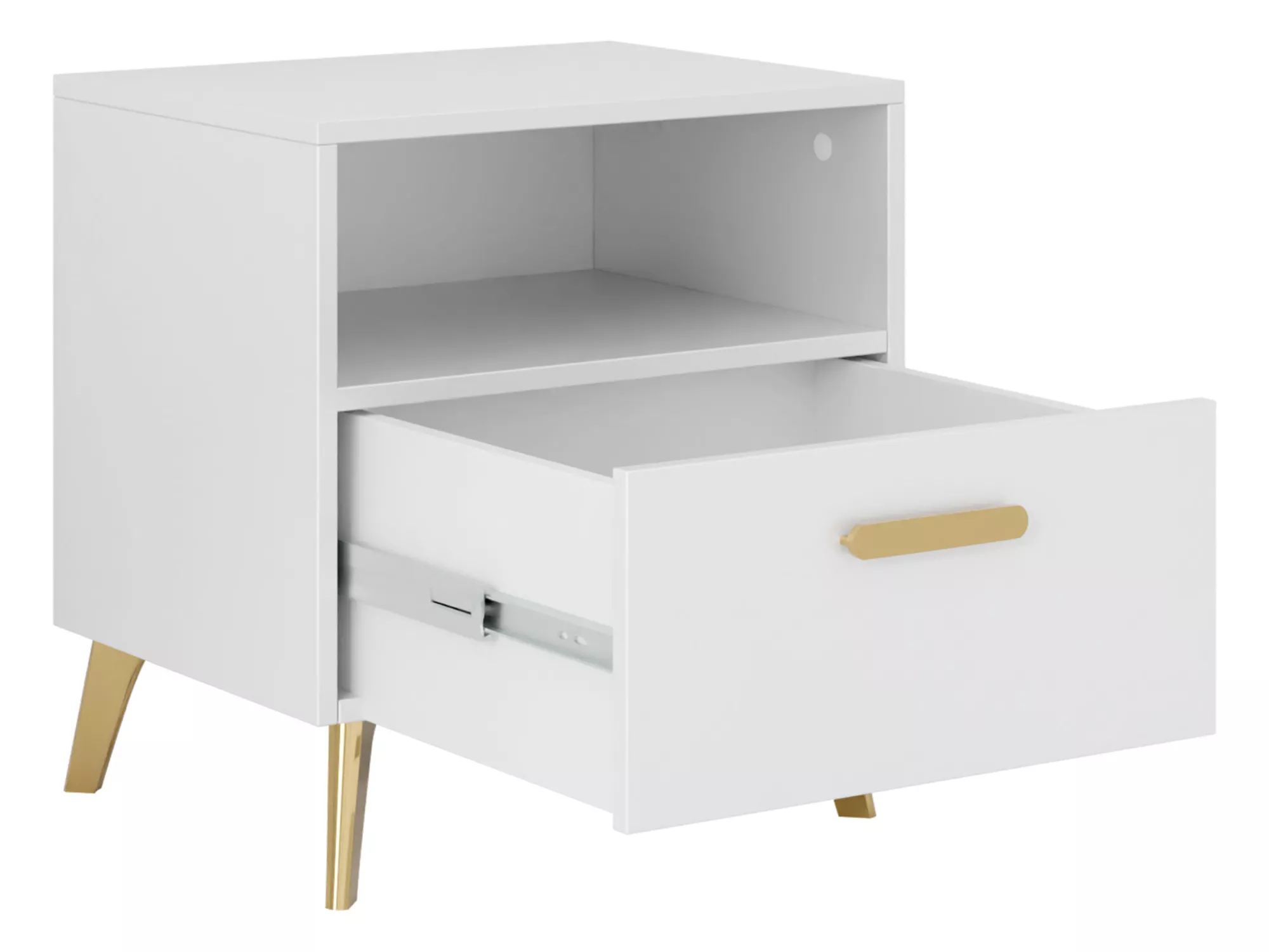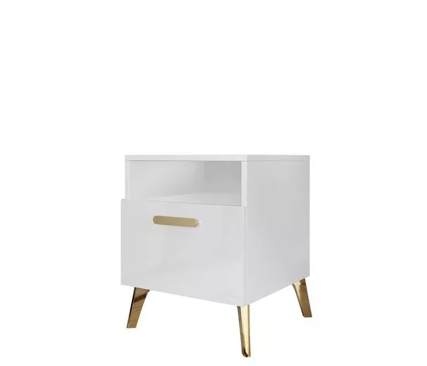 Dodejte své ložnici eleganci a praktičnost s nočním stolkem TANTES. Moderní design na lesklých zlatých nohách dodá interiéru luxusní nádech a styl. Lesklá čela podtrhují jeho exkluzivní vzhled, zatímco prostorná zásuvka a otevřená polička zajistí dostatek místa pro knihy, kosmetiku či elektroniku.