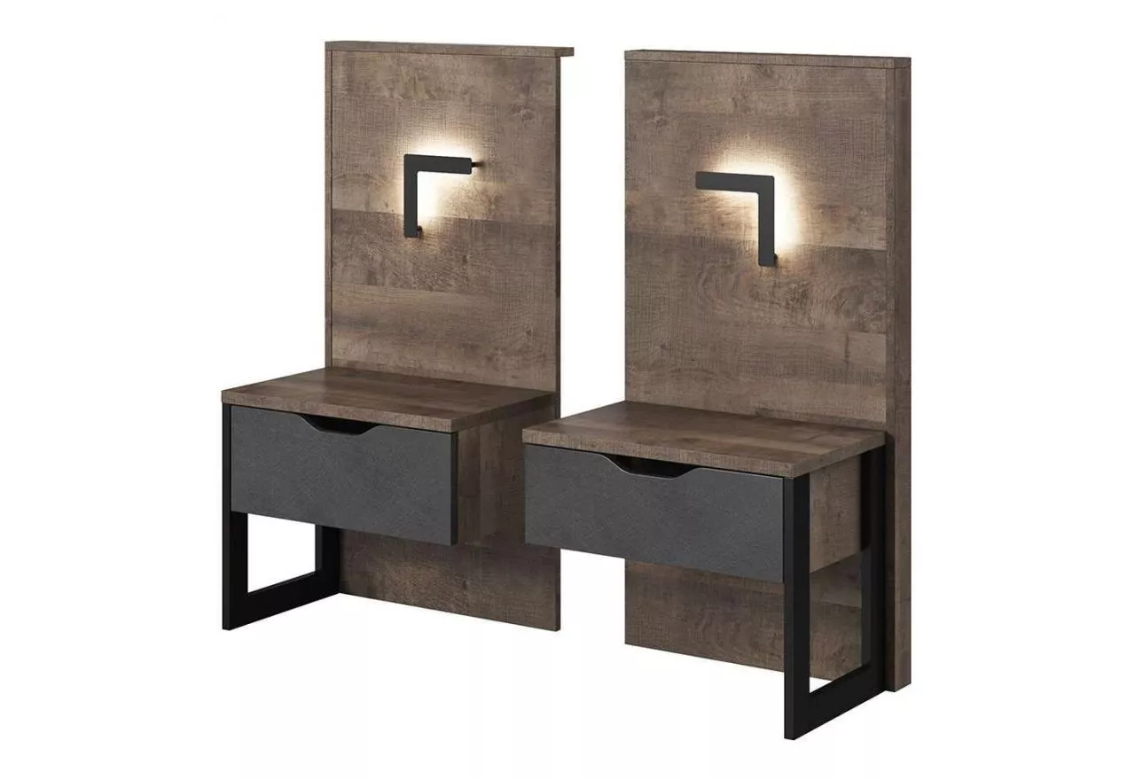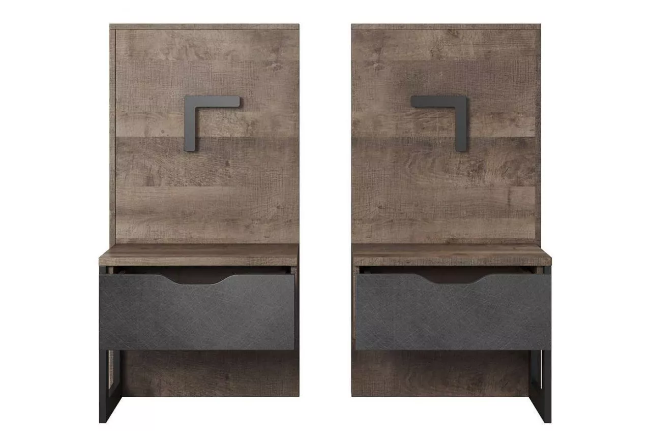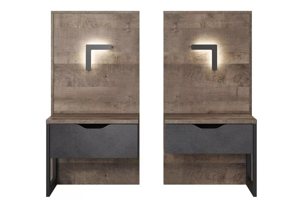 Set 2 nočních stolků GORDO v originálním industriálním stylu dodá ložnici jedinečnou loftovou atmosféru. Kombinace dekoru dubu s lehce poškrábaným, tmavě šedým dekorem matera působí syrově a přitom stylově. Každý stolek je vybaven praktickou zásuvkou. Zajímavé LED osvětlení podtrhne celkový dojem moderního, promyšleného interiéru.