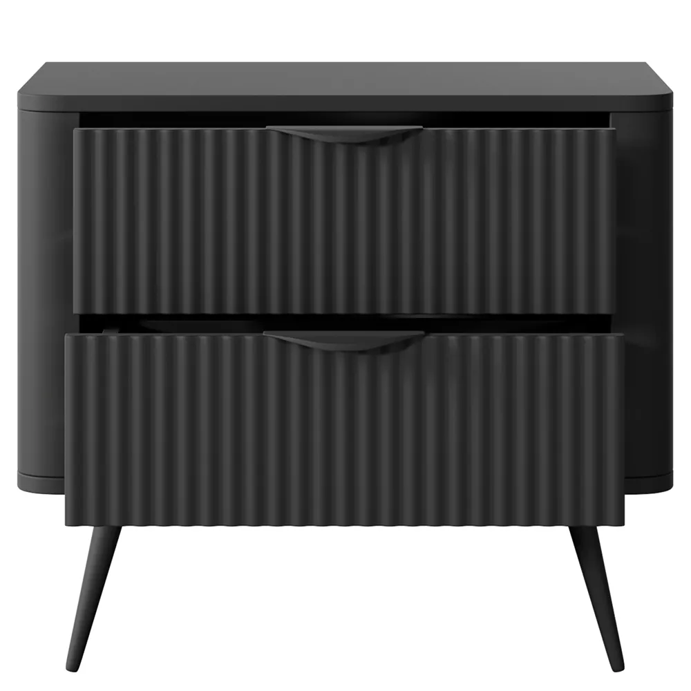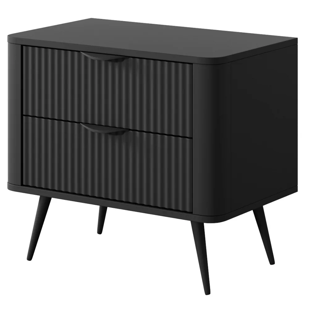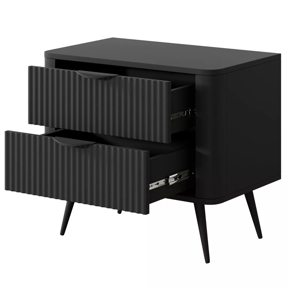Noční stolek MOODY je ztělesněním jemnosti, lehkosti a elegance, které vnášejí do interiéru klid a harmonii. Černá barva v kombinaci se zlatými úchytkami a kovovými válcovitými nohami vytváří luxusní a vkusný vzhled. Drážkovaná čela zásuvek podtrhují moderní styl, a zároveň zachovávají okouzlující a vyvážený dojem.