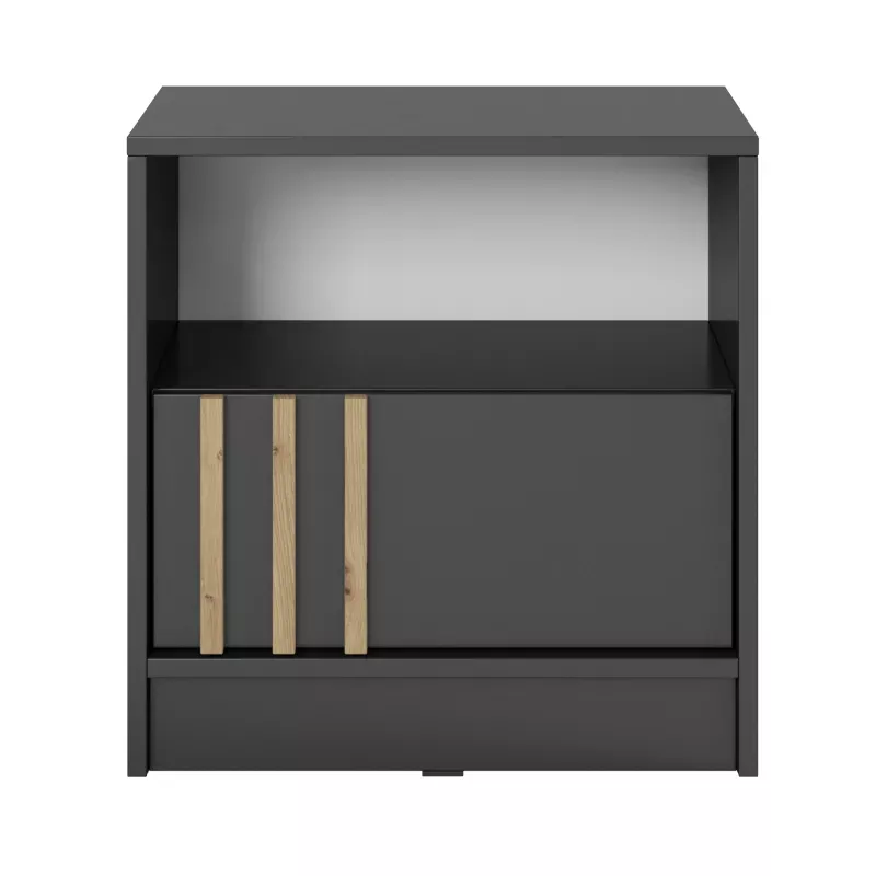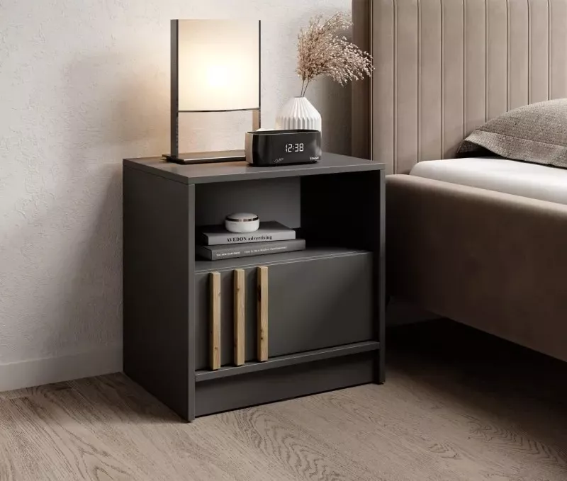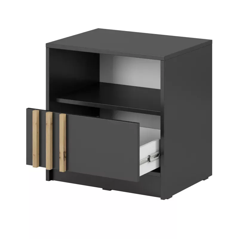 Noční stolek MARFA zaujme především svými dekorativními lamelami na čele šuplíku. Stolek skvěle zapadne do všech ložnic. Díky otevřené přihrádce a šuplíku budete mít všechny věci hned po ruce.