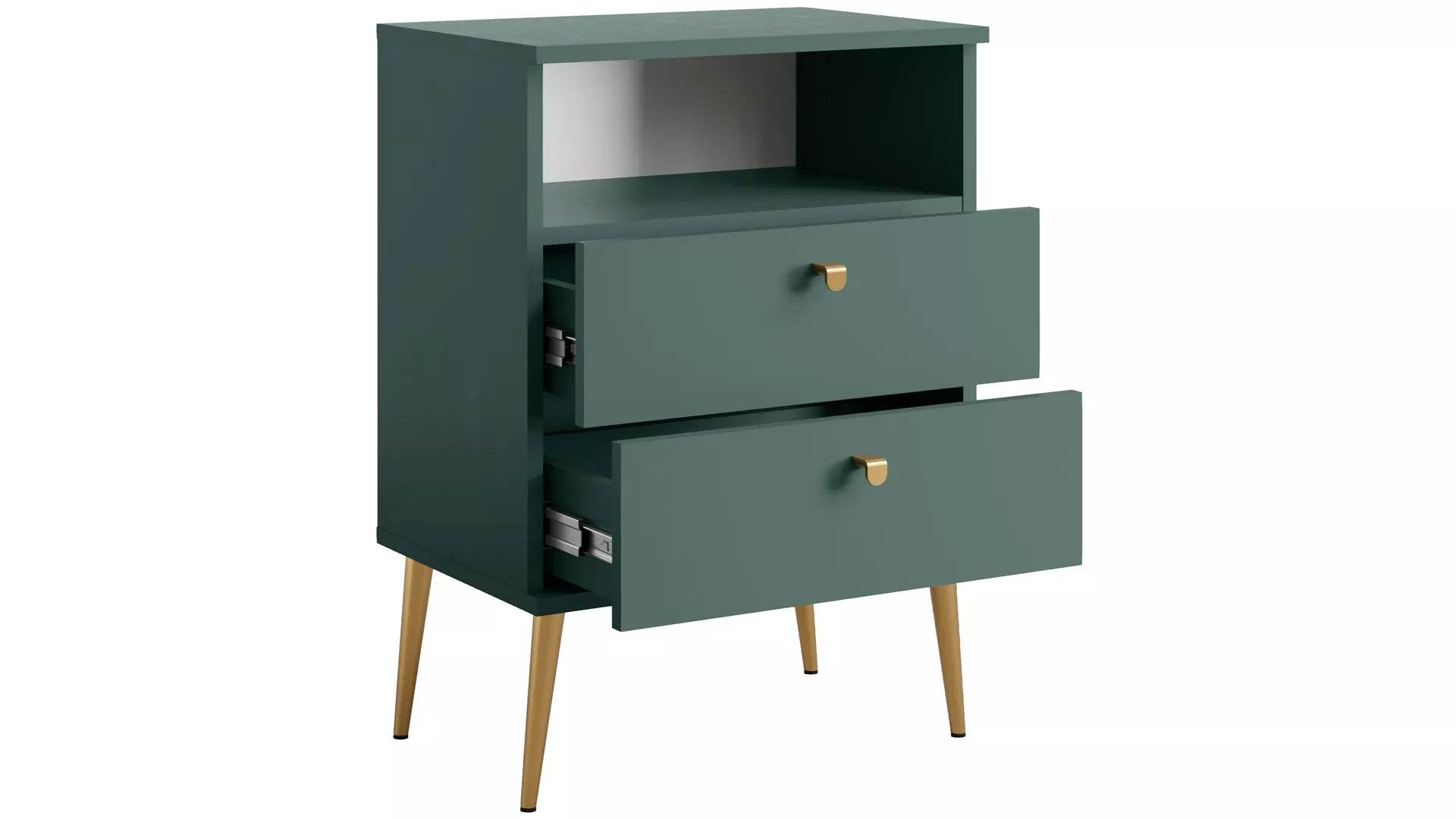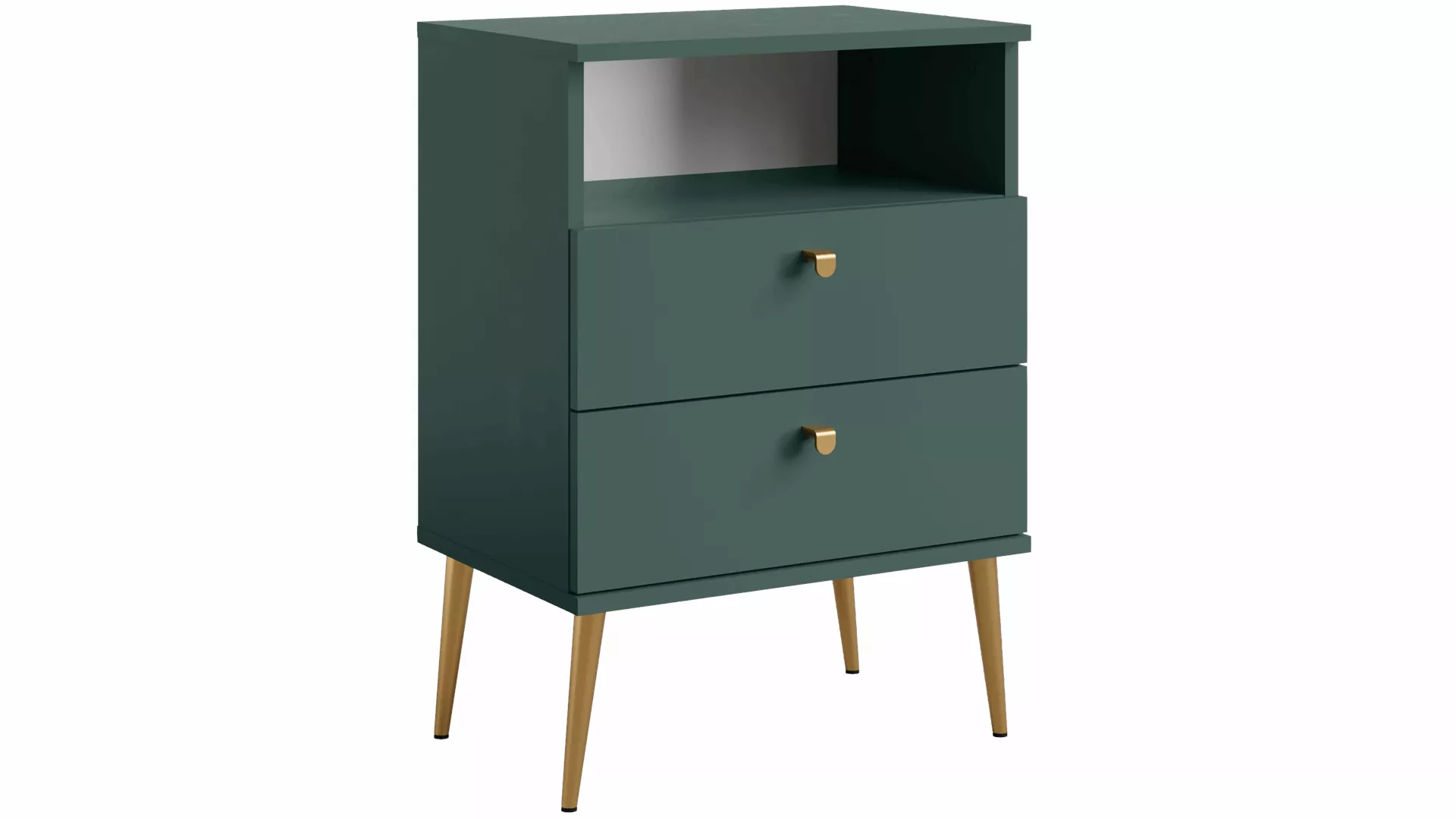 Objevte noční stolek RETIRO s elegantními liniemi a štíhlým tvarem na vysokých nohách. 2 praktické zásuvky a polička poskytují dostatek úložného prostoru pro vše potřebné. Díky moderním detailům se skvěle hodí jak do klasických, tak současných interiérů.