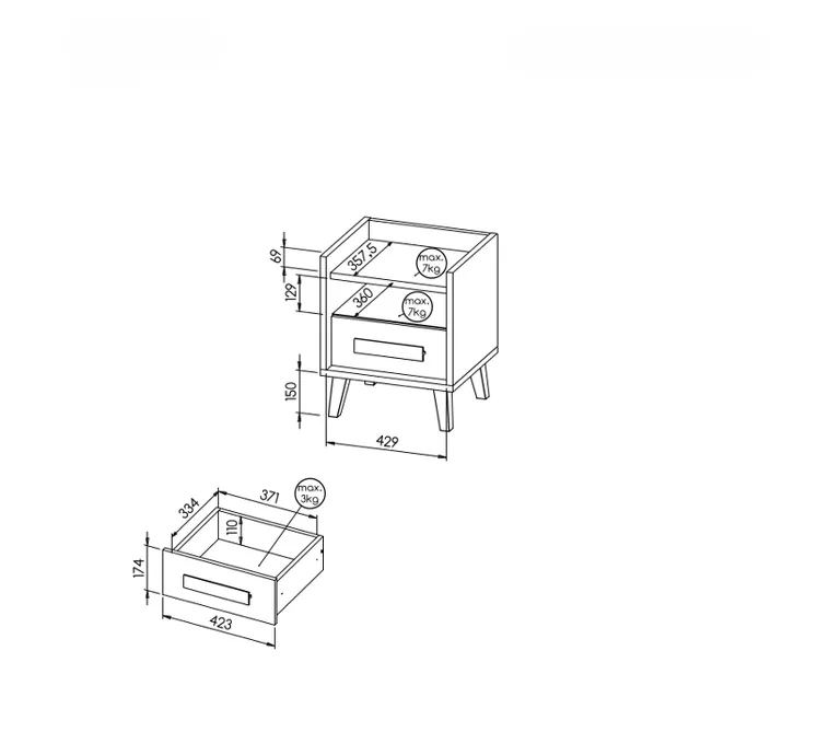 Noční stolek DOBSON vám umožní mít vše důležité u postele vždy po ruce. Praktický šuplík i otevřená polička nabízejí dostatek úložného prostoru. Stabilitu stolku zajišťují pevné masivní nohy.