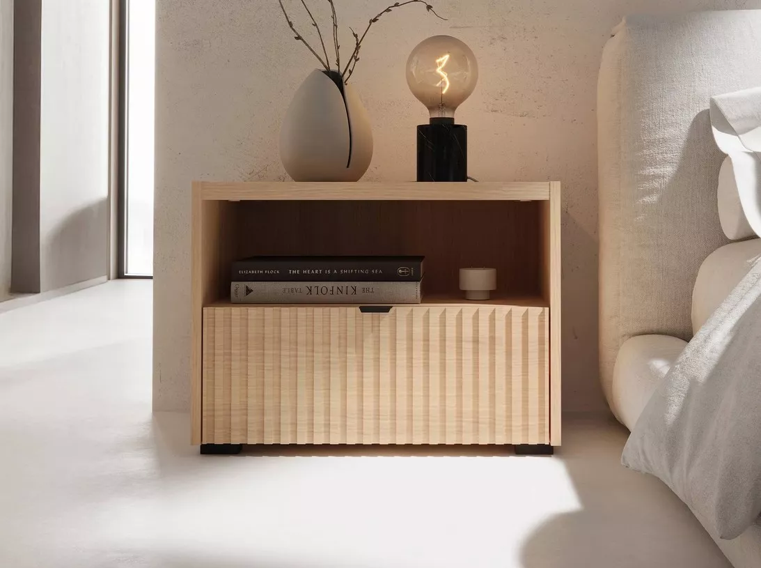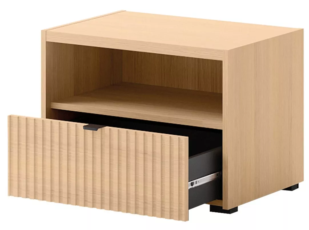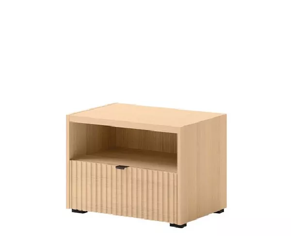 Noční stolek TROUTDALE vyniká minimalistickým tvarem a stylovým drážkovaným čelem šuplíku. Kombinace šuplíku a otevřené police poskytuje praktický úložný prostor pro nezbytnosti. Deska stolku nabízí místo pro dekorace, včetně noční lampičky.