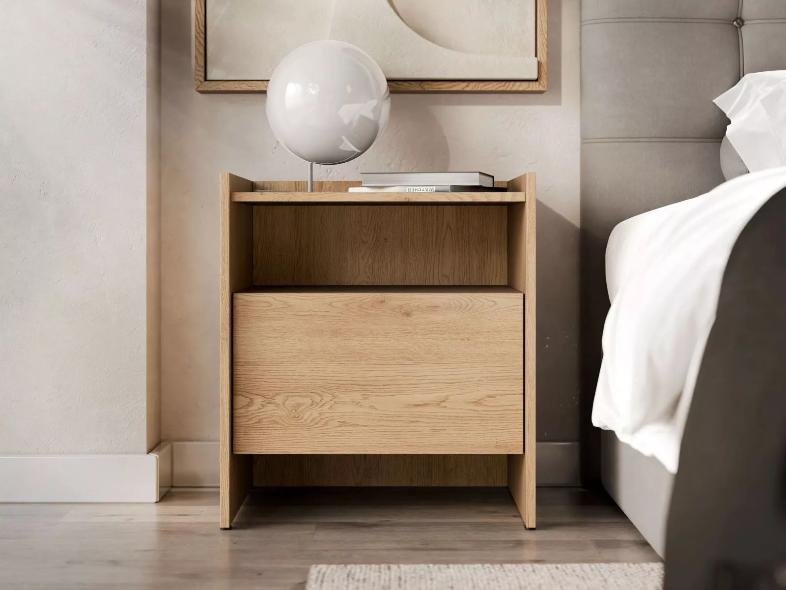 Dopřejte si noční stolek DESMONES, který vnáší do ložnice klid a harmonii. Stolek kombinuje japonský minimalismus a estetiku s útulností a funkčností skandinávského designu. Kombinace šuplíku a otevřené police poskytuje praktický úložný prostor pro nezbytnosti. Deska stolku nabízí místo pro dekorace, včetně noční lampičky.