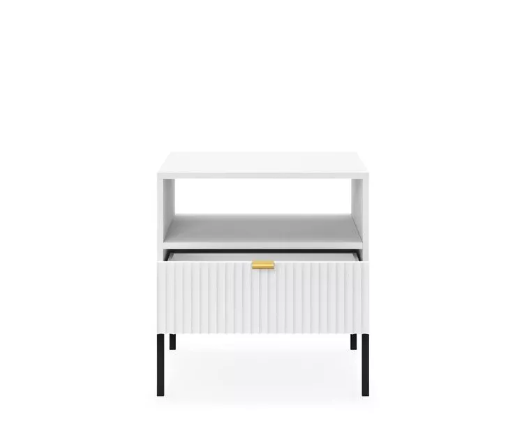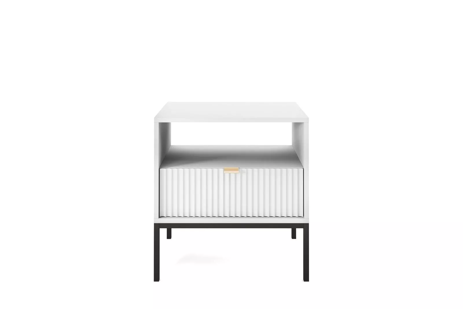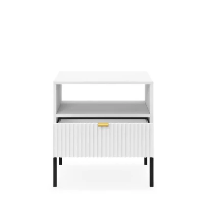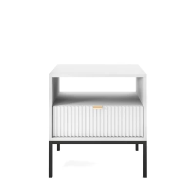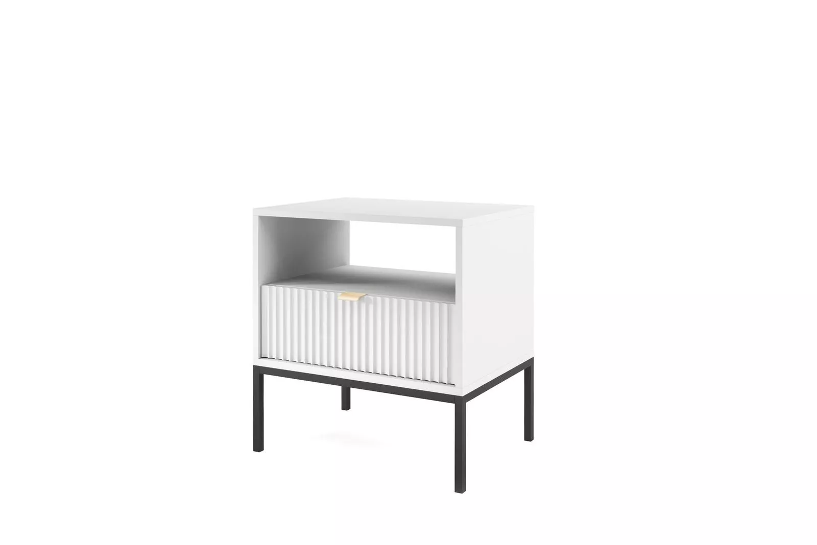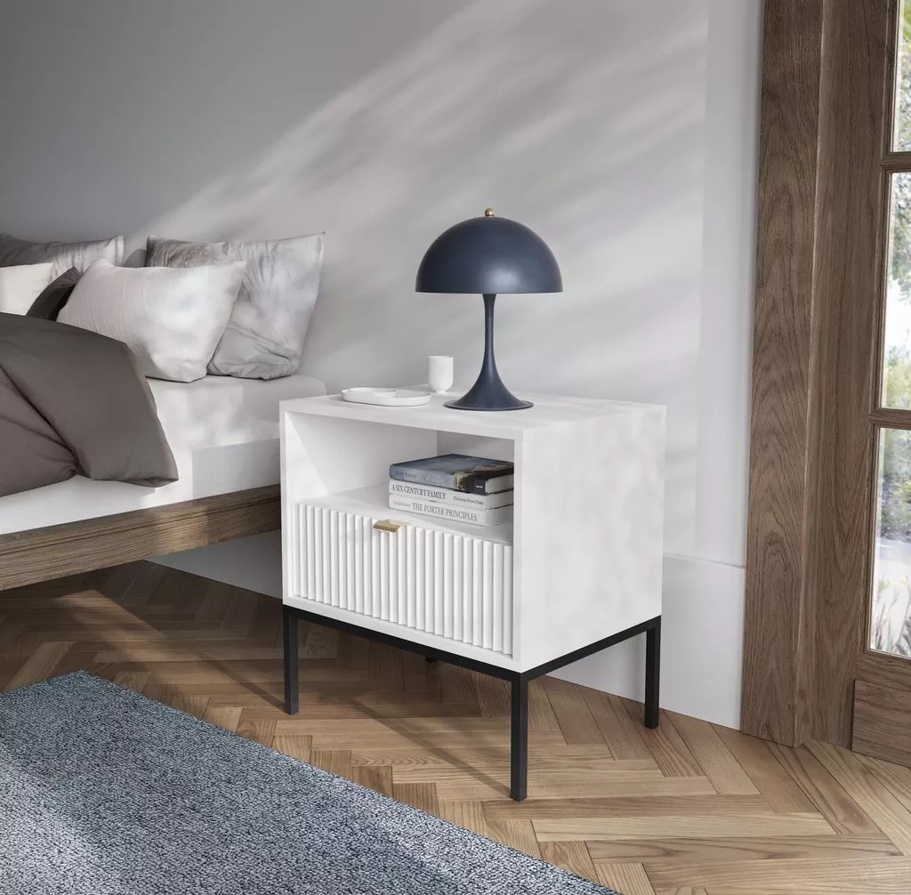 Noční stolek MISHEEL je charakteristický svým originálním designem v podobě drážkované přední části šuplíku. Disponuje šuplíkem a otevřenou policí, kde můžete vložit potřebné věci. Kovová podstava dodává stolku pevnost a stabilitu.
