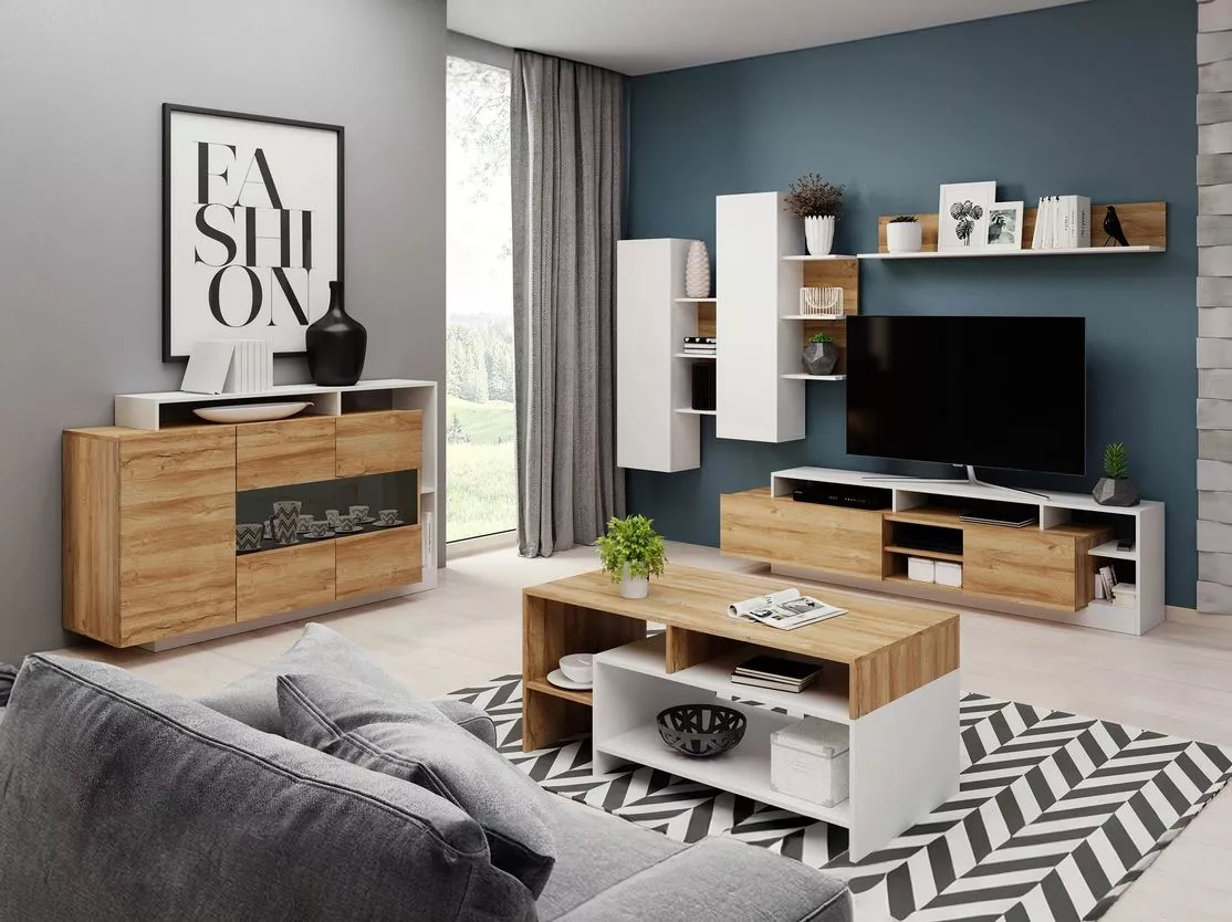 Sestava nábytku do obývacího pokoje ERICKA je vyrobena v nadčasových barvách, které skvěle zapadají do dnešních trendů interiérového designu. Sestava obsahuje prostorný TV stolek, závěsné skříňky, závěsnou polici, komodu s dvířky a funkční konferenční stolek, což poskytuje ideální kombinaci úložného prostoru a estetického vzhledu. Materiál použitý k výrobě nábytku je odolný proti vlhkosti a poškrábání, což zajišťuje dlouhou životnost a snadnou údržbu.