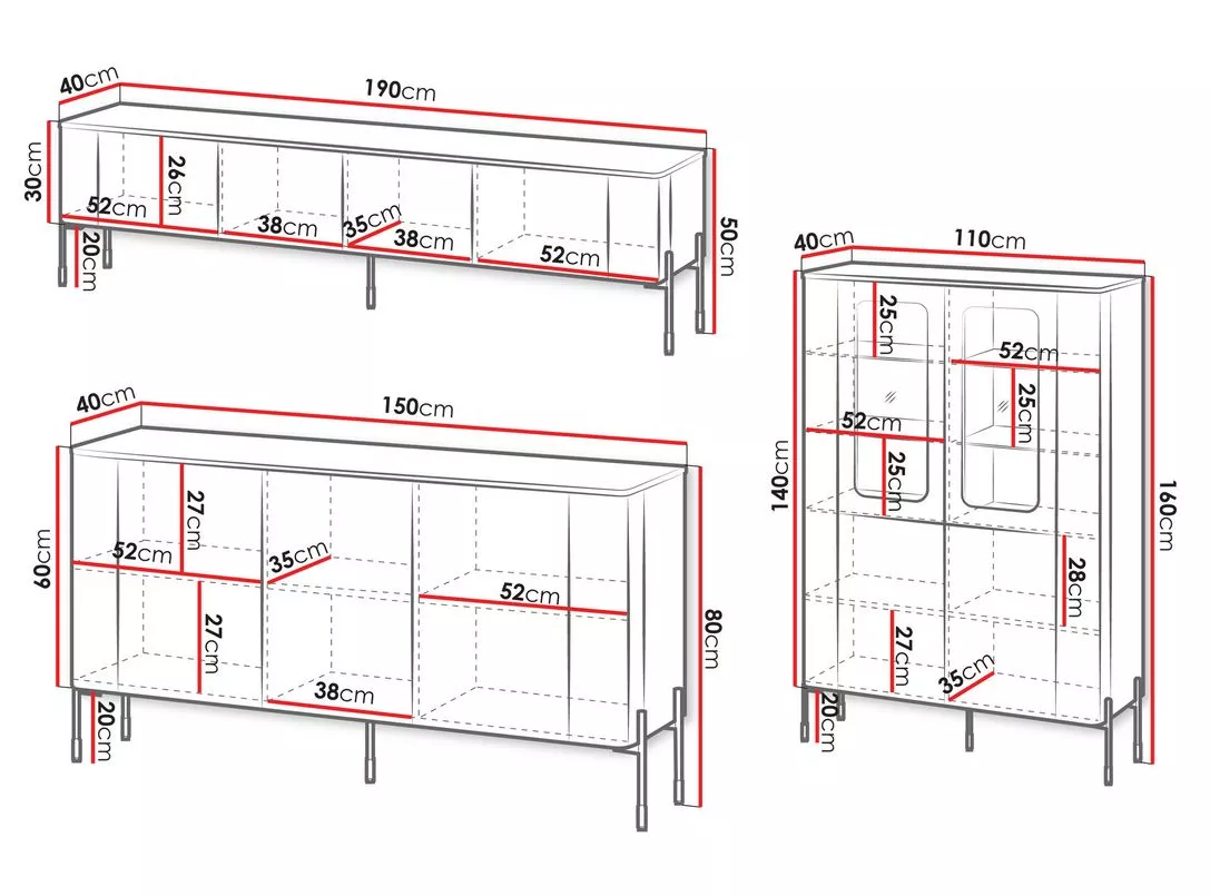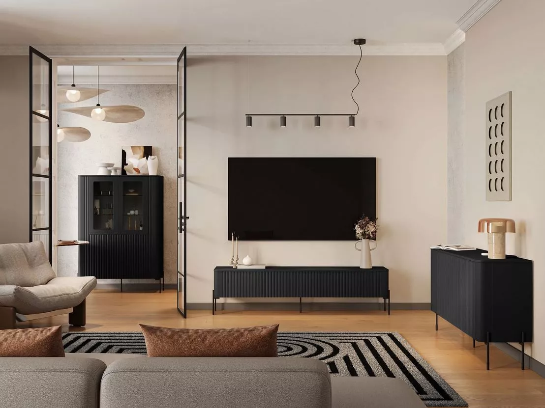 Vytvořte si stylový a funkční interiér s moderní sestavou do obývacího pokoje CALERA, která spojuje elegantní design a praktické řešení. Sestava zahrnuje komodu, prosklenou vitrínu a televizní stolek, přičemž každý kus nábytku zaujme jemným frézováním na dvířkách a bezúchytkovým systémem PUSH TO OPEN. Štíhlé černé kovové nohy dodávají celé sestavě lehkost a podtrhují její moderní charakter.