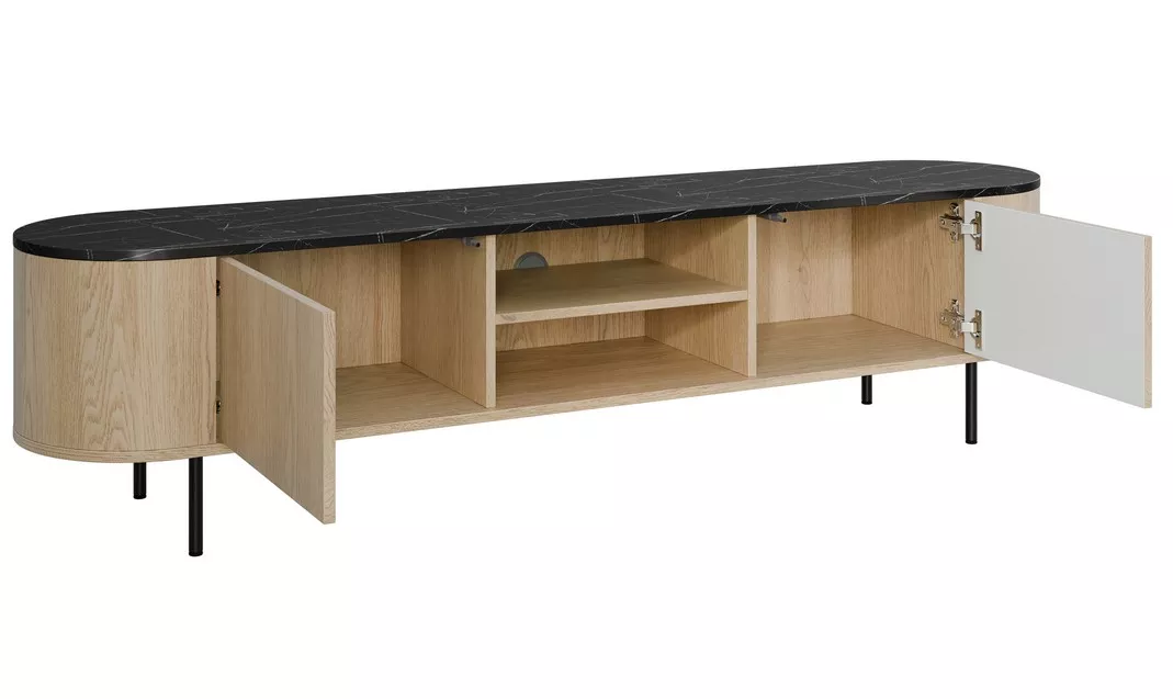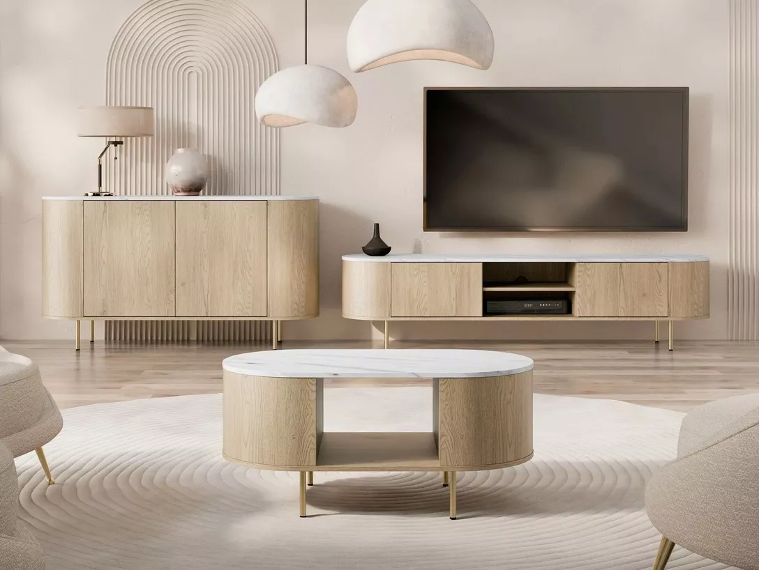 Zařiďte si obývací pokoj stylově s nábytkem TANGIER, kde vysoké nohy, zaoblené boky a mramorová horní deska vytvářejí jedinečný vizuální efekt. Minimalistický a zároveň výrazný design v duchu stylu Japandi dodává prostoru eleganci a charakter. Inovativní systém PUSH TO OPEN zajišťuje tiché a snadné zavírání, čímž kombinuje praktičnost s moderním vzhledem.