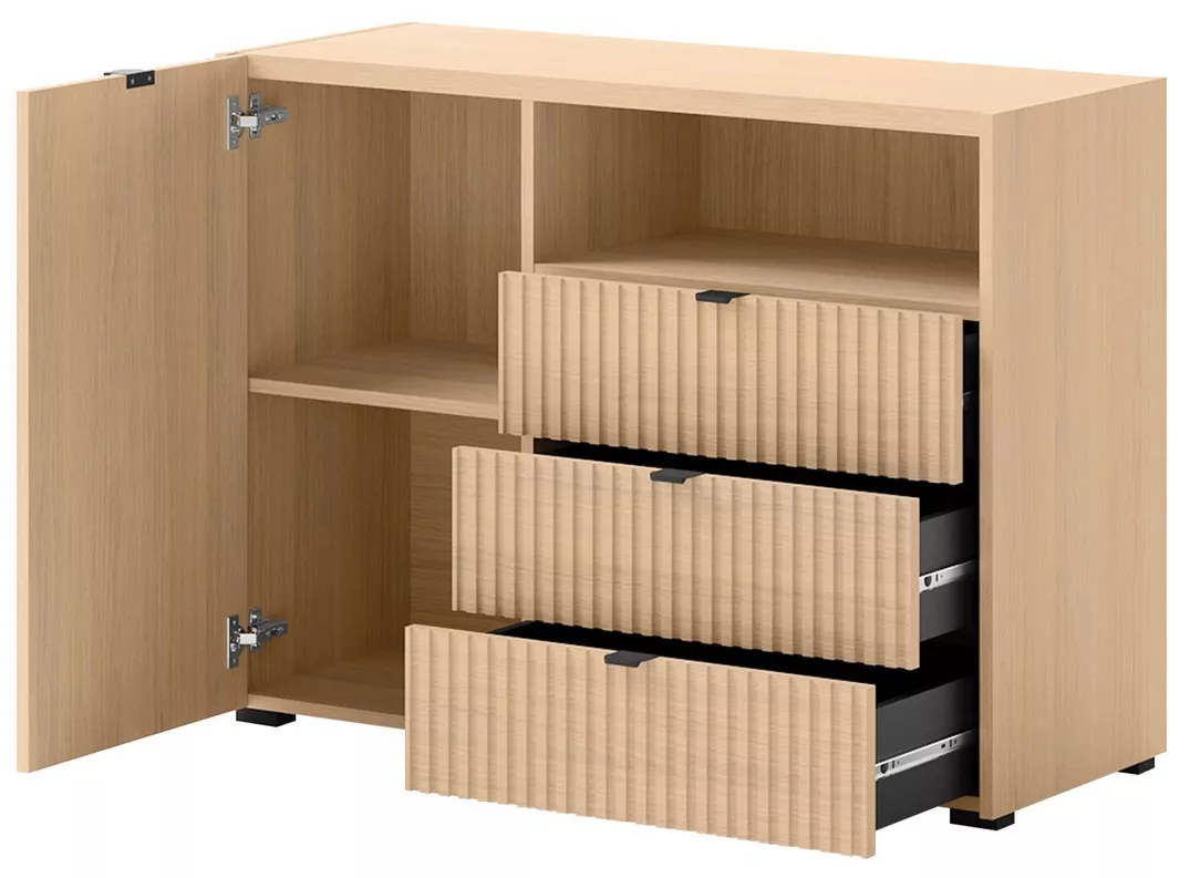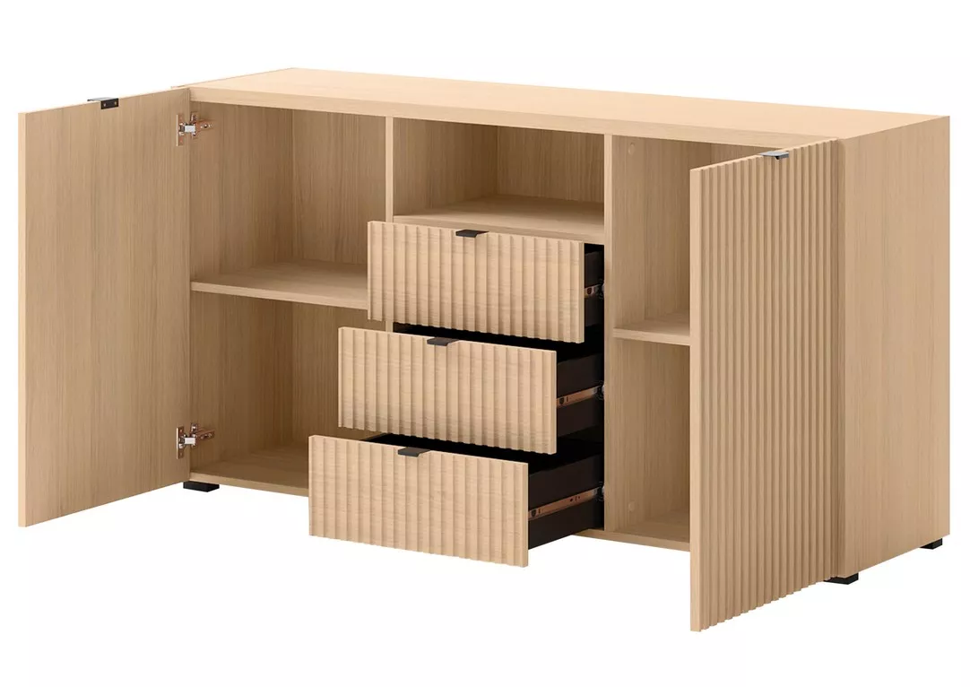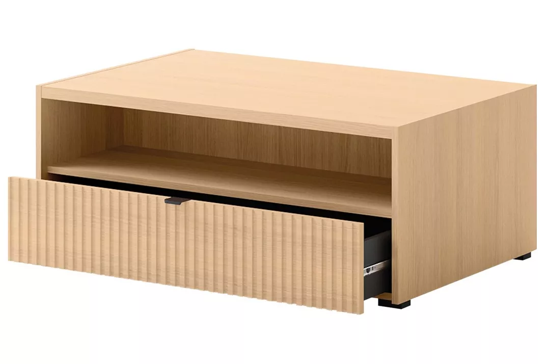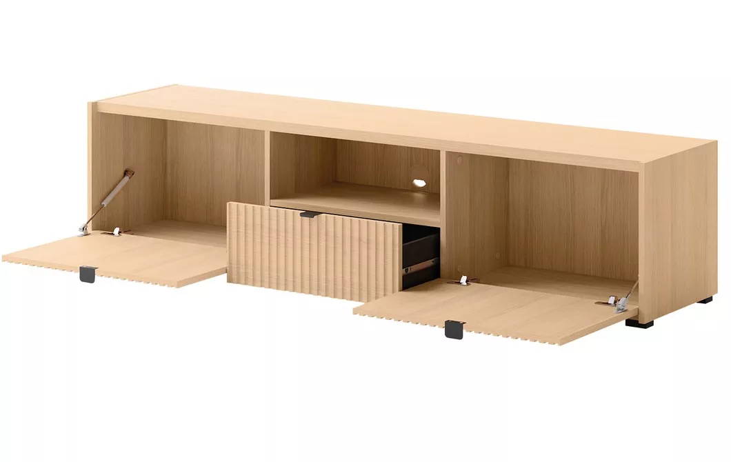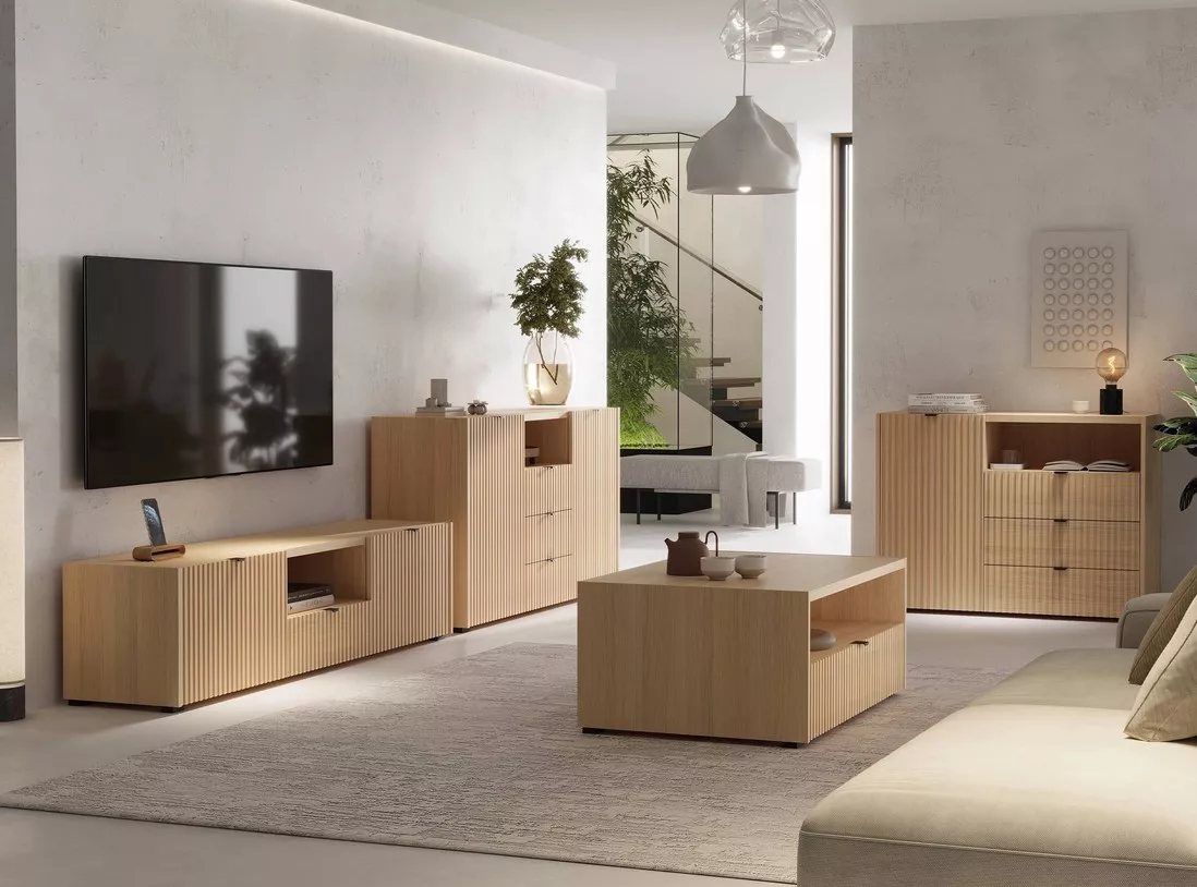 Nábytek do obývacího pokoje TROUTDALE zaujme jednoduchým tvarem a výrazným vertikálním frézováním. Televizní stolek s uzamykatelnými skříňkami, praktickou zásuvkou a otevřenou policí poskytuje dostatek úložného prostoru, zatímco 2 komody nabídnou prostorné skříňky a široké desky pro doplňky. Nízký konferenční stolek s obdélníkovou deskou dokonale doplňuje celkový design.