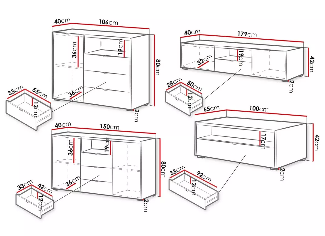 - čelo zásuvky: MDF o síle 18 mm potažená PVC fólií