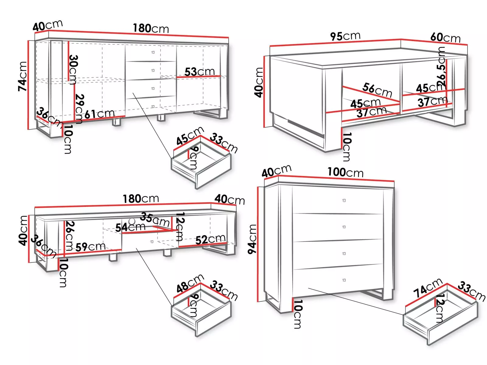 Pořiďte si sestavu do obývacího pokoje LUMOS a dopřejte prostoru styl s jemnými zlatými akcenty. Sestava nabízí dostatek úložného prostoru i prostor pro vystavení dekorací. Obsahuje 2 komody, konferenční stolek a televizní stolek, které dohromady tvoří harmonický celek. Moderní design sestavy dokonale doplní každý obývací pokoj.