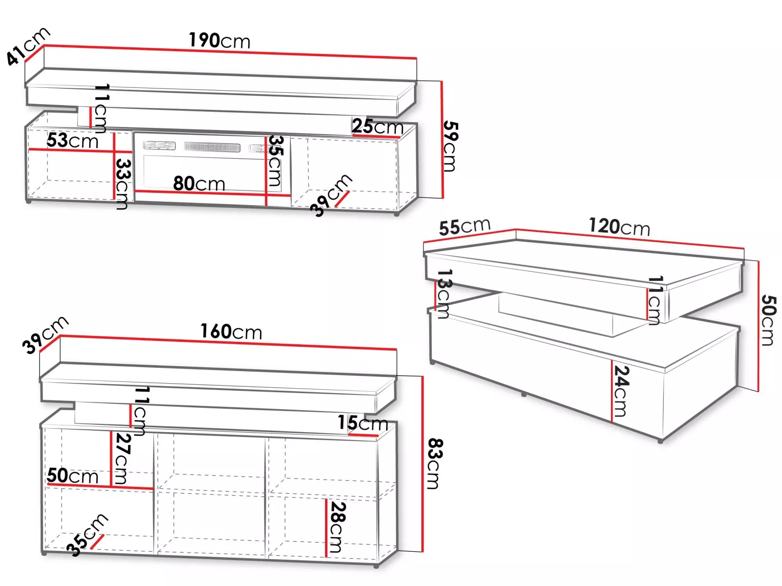- televizní stolek s elektrickým krbem: 190/59/41 cm