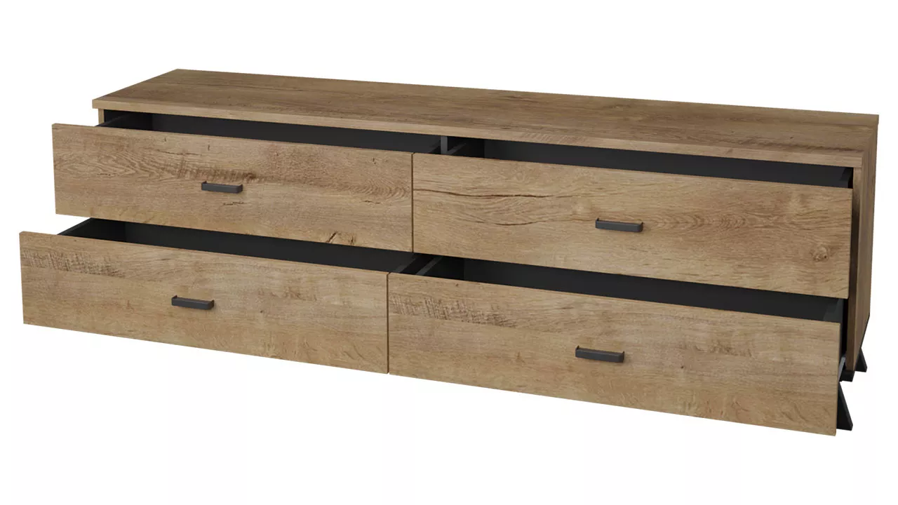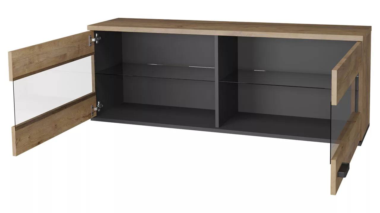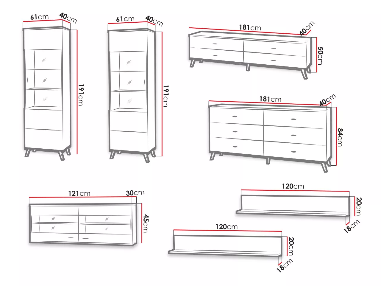 Sestava nábytku do obývacího pokoje TERESEN 1 je komplexní obývací sestava, která dodá vašemu obývacímu pokoji módní charakter. Tlumený vzhled byl efektně doplněn módními detaily v tmavém interiéru vitrín a závěsné skříňky. Toto řešení zdůrazňuje průmyslový design nábytku do obývacího pokoje. Sestava se skládá z několika prvků, které poskytnou dostatek úložného prostoru. Prvním prvkem sestavy jsou dvě vysoké vitríny. Prosklené části vitrín poskytují dostatek úložného prostoru pro vystavení knih, dekorací nebo porcelánu. Uzavřené části slouží k úschově sezónního oblečení, nádobí nebo ubrusů. Šuplíková komoda o šířce 181 cm poskytuje další úložný prostor. Dalším prvkem sady je TV stolek. TV stolek je vybaven dvěma zásuvkami pro úschovu televizního příslušenství. Posledním prvkem sestavy je závěsná vitrína a police.