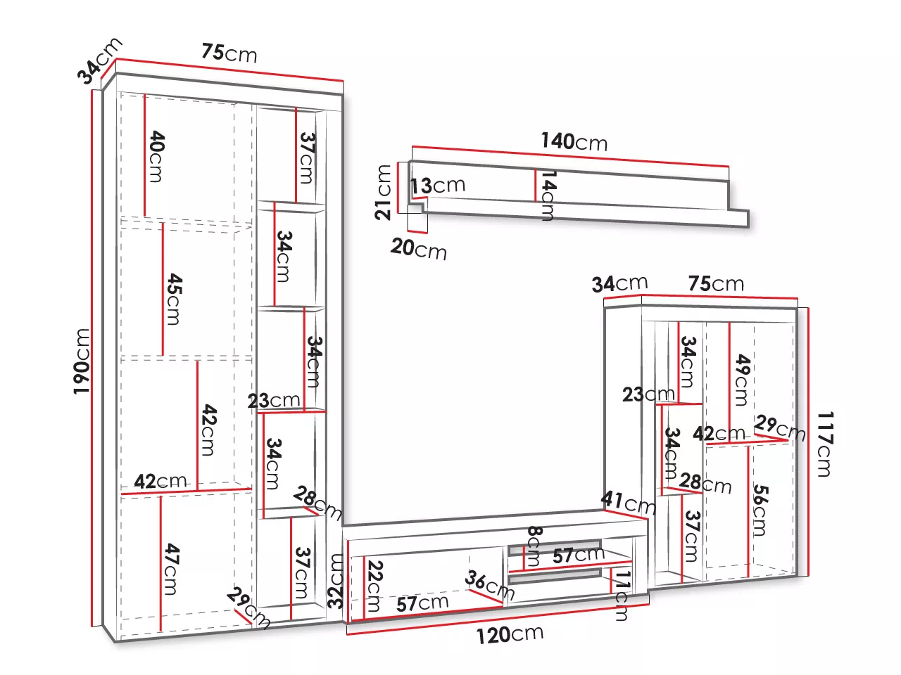 - nízká vitrína: 75/117/34 cm