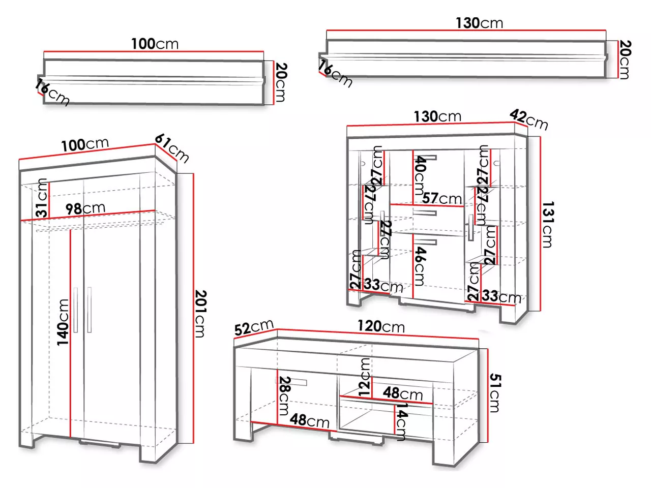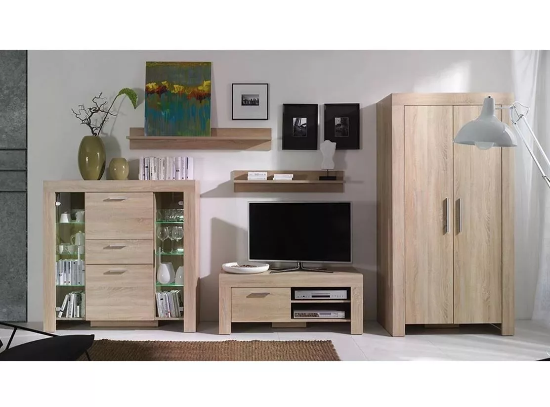 Obývací stěna TAKA vyniká praktickým uspořádáním a neutrálním dekorem dřeva, který zapadne do každého interiéru. Stěna zahrnuje šatní skříň s šatní tyčí, prosklenou komodu s LED osvětlením, TV stolek a závěsné police, které nabízejí dostatek úložného i výstavního prostoru. Ideální volba pro malé i velké obývací pokoje.