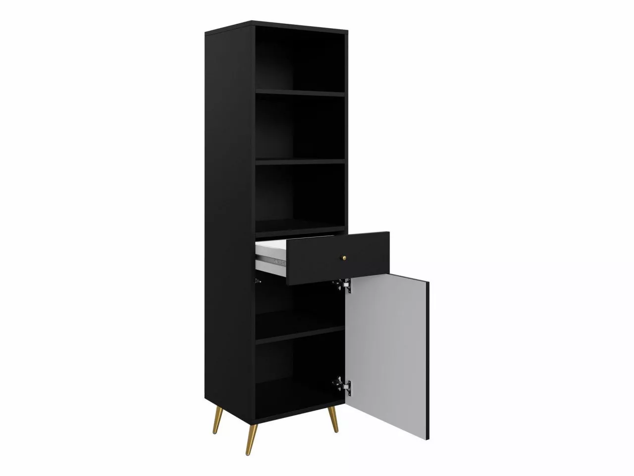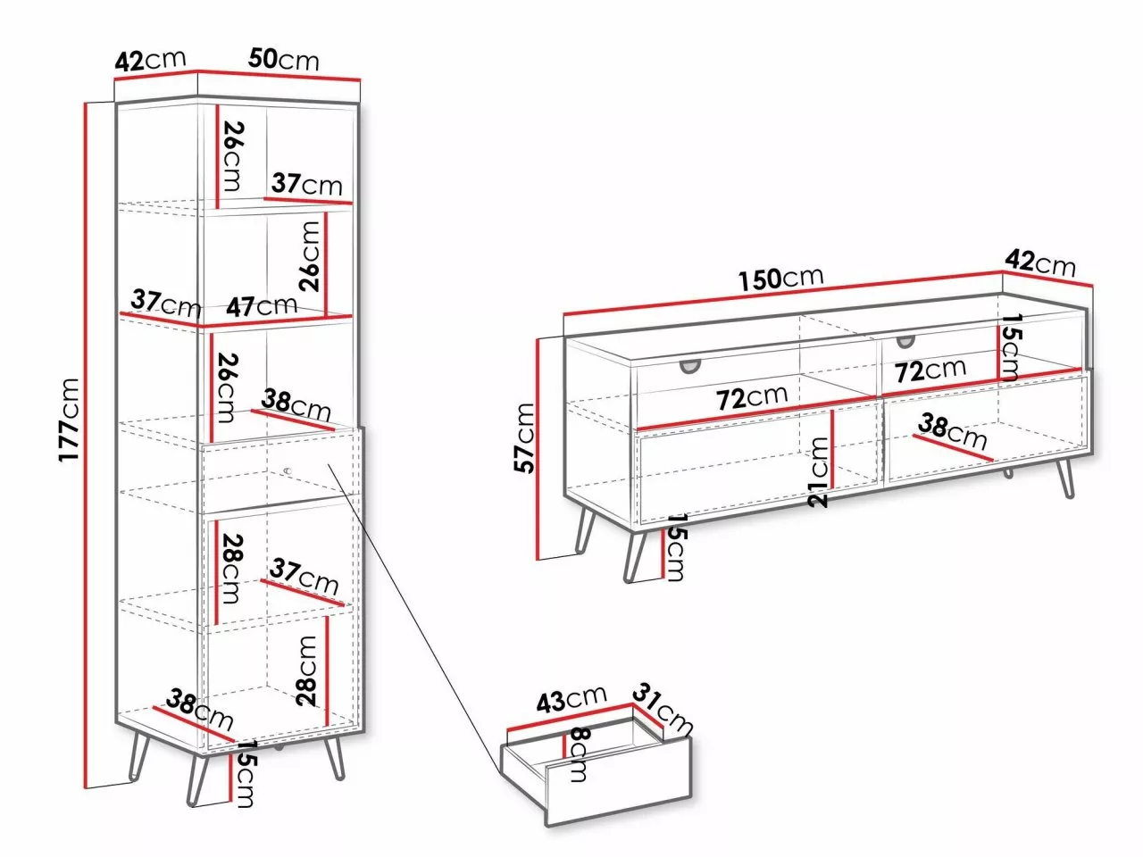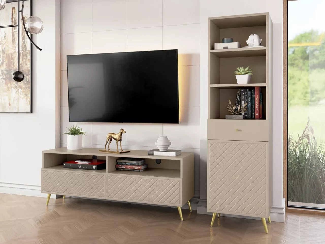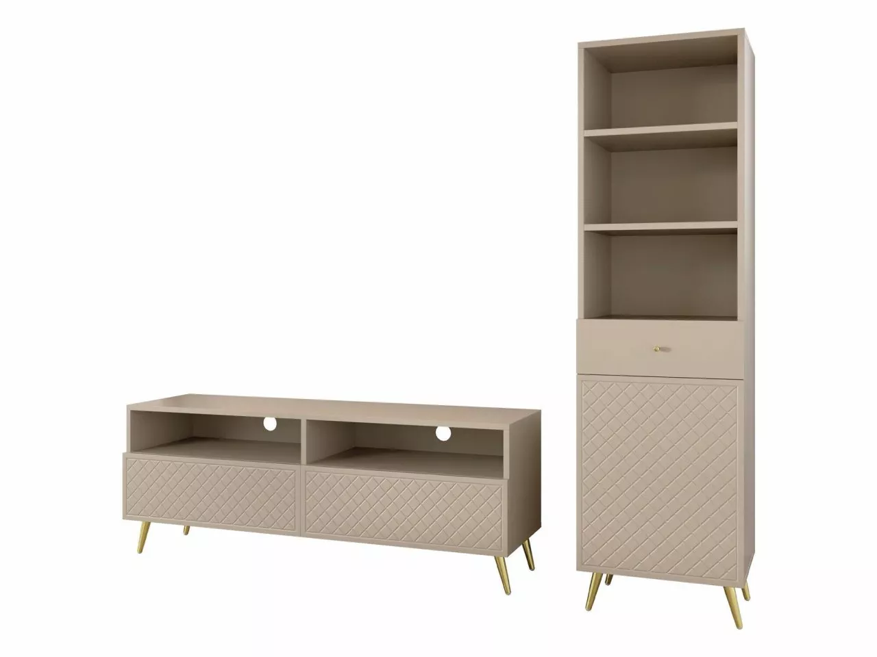 Stěna TAGO je dokonalým příkladem moderní elegance. Díky minimalistickému vzhledu a exkluzivním detailům, jako jsou frézované přední díly a vysoké zlaté nožky, přináší do vašeho obývacího pokoje luxusní atmosféru. Vysoký regál a televizní stolek s poličkami a šuplíky spojují styl s praktičností, což oceníte v každodenním používání.