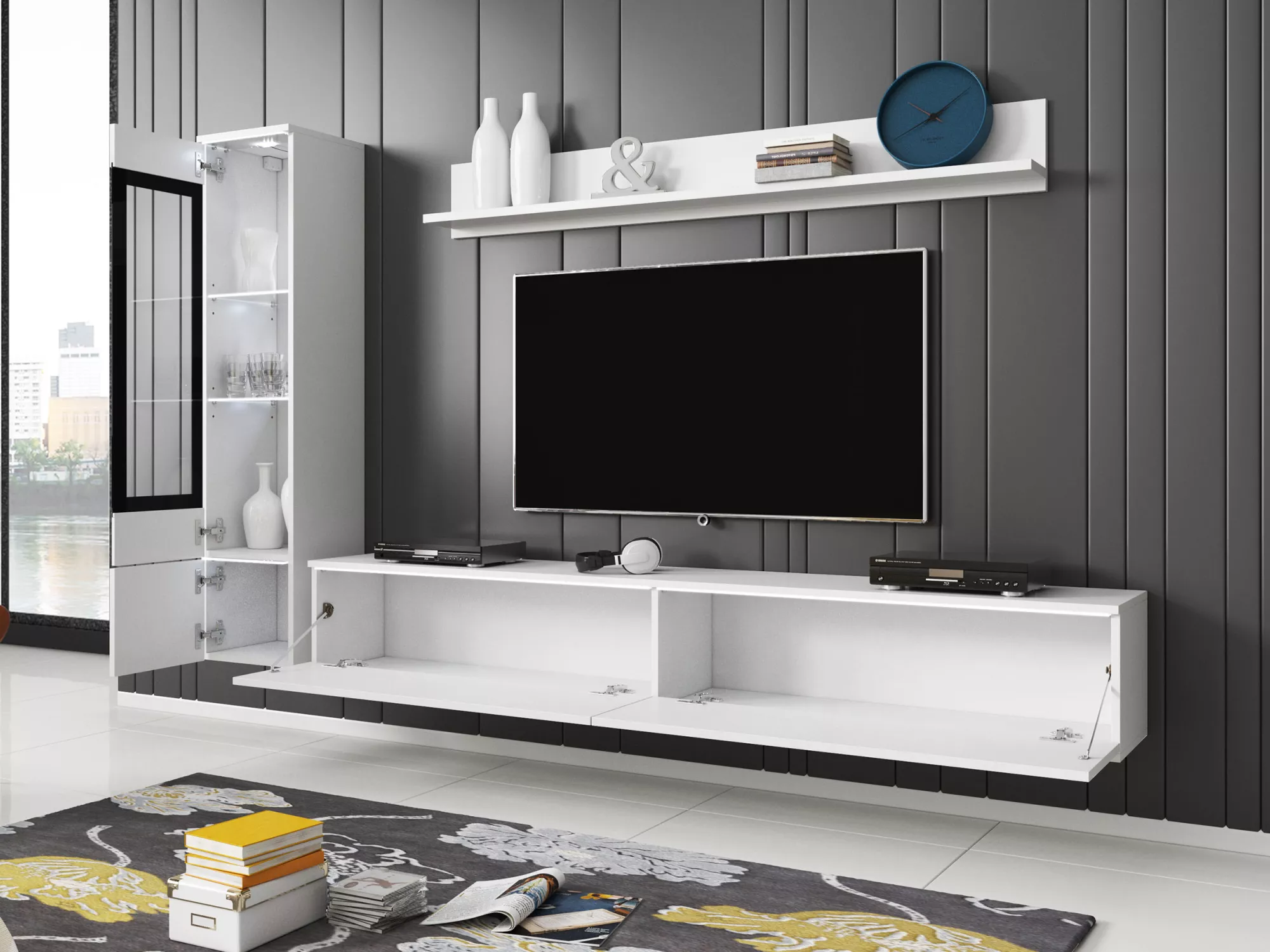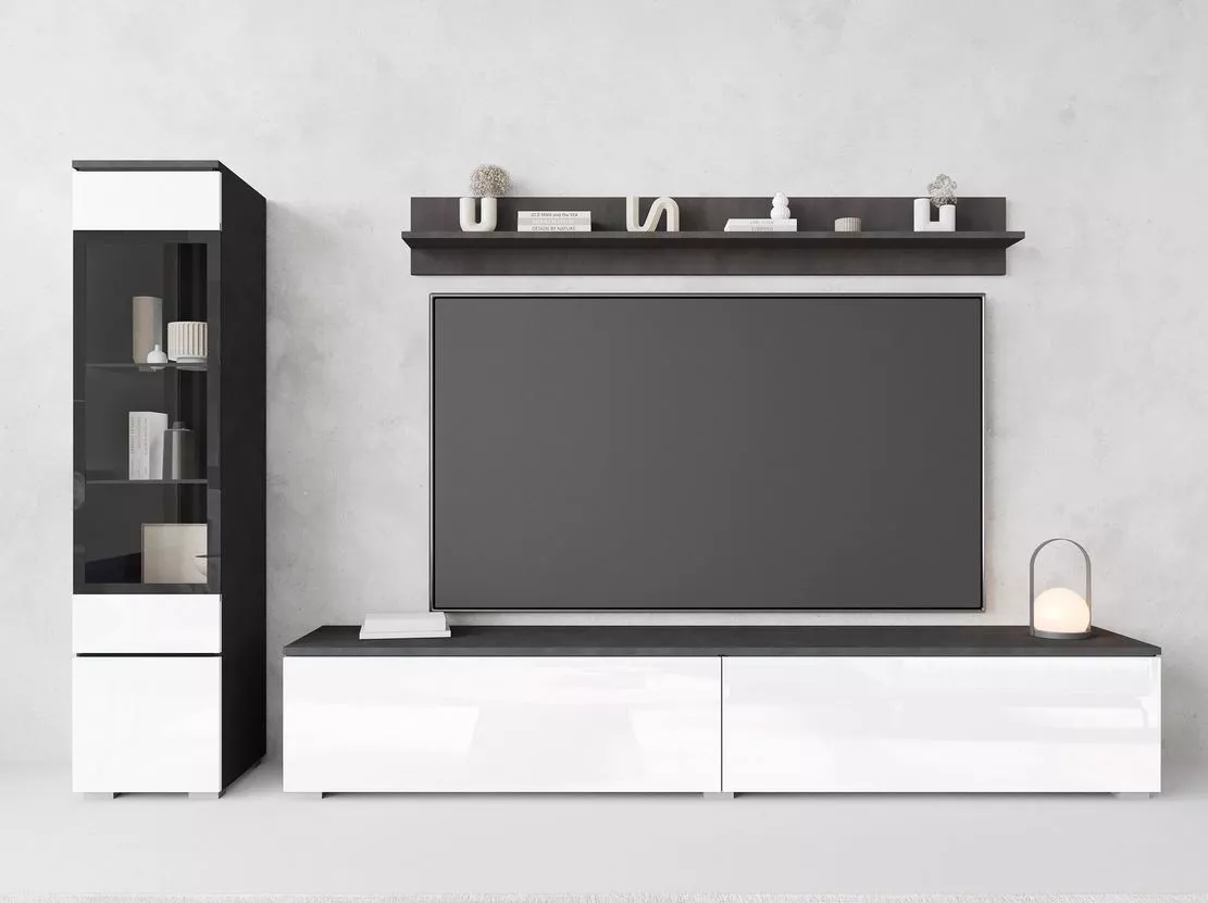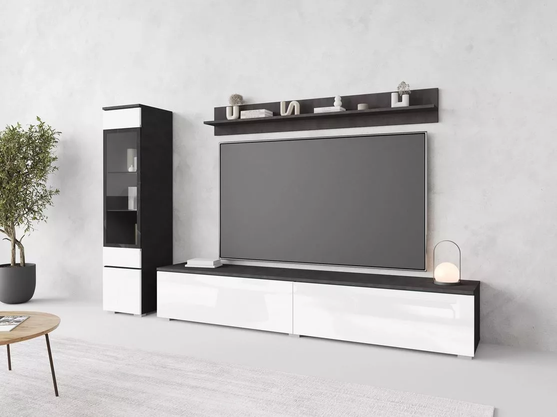 Obývací stěna WANDA nabízí jednoduché a funkční vybavení vašeho obývacího pokoje. Skládá se z prostorné TV skříňky, která vám umožní uložit nejnutnější předměty a schovat kabeláž, závěsné police na vystavení fotorámečků a květin a prosklené vitríny, kterou doplňuje bílé LED osvětlení.
