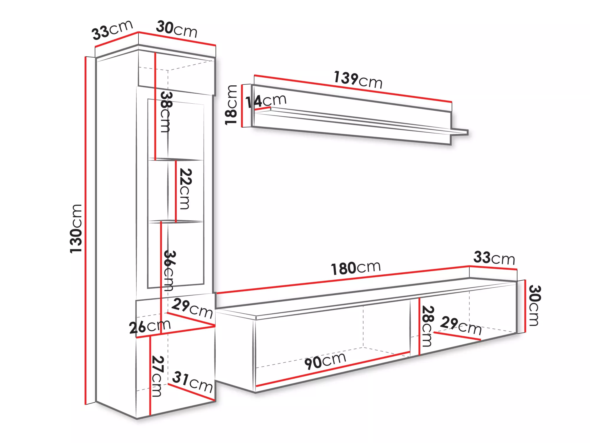 - TV skříňka: 180/30/33 cm