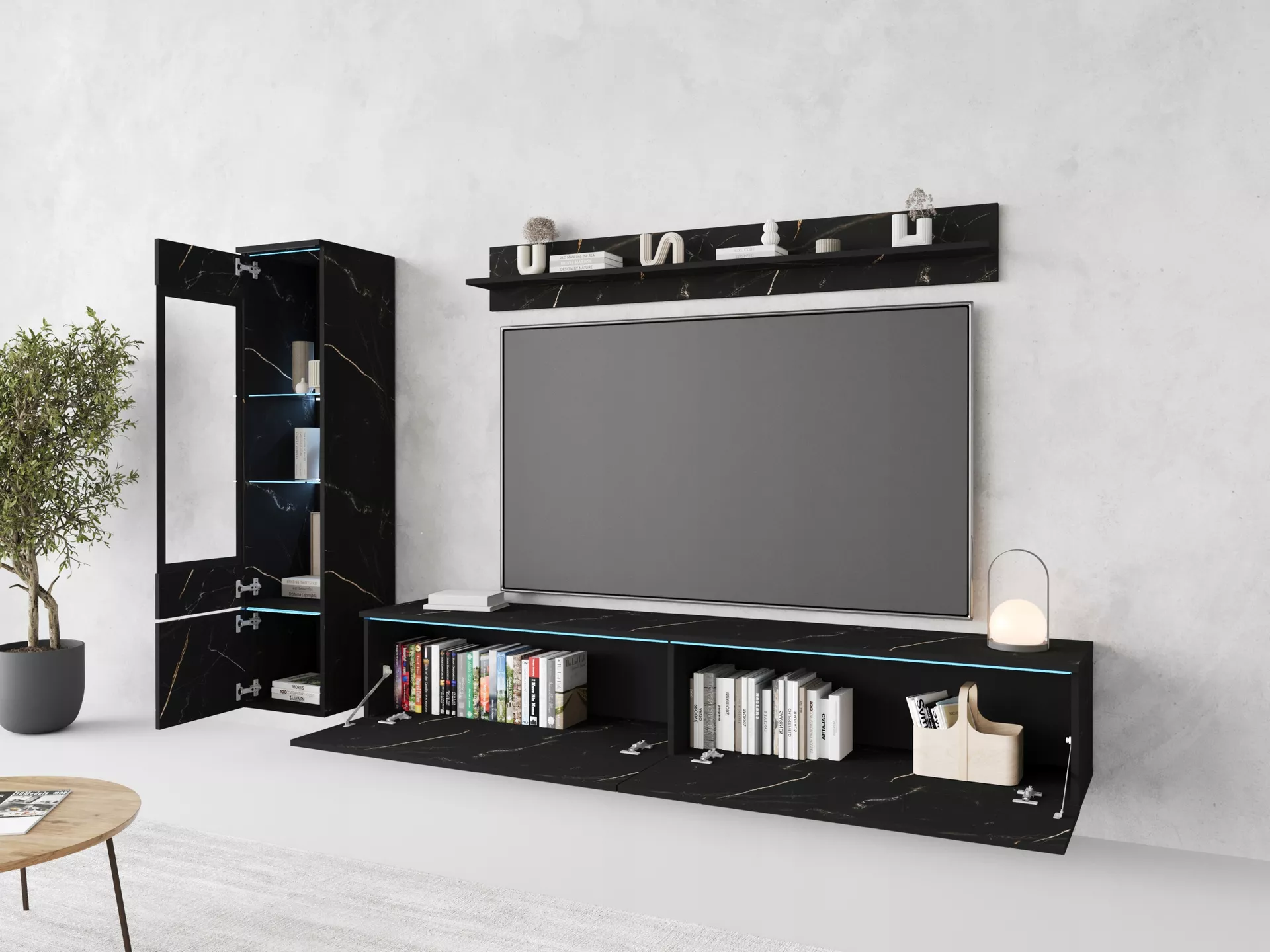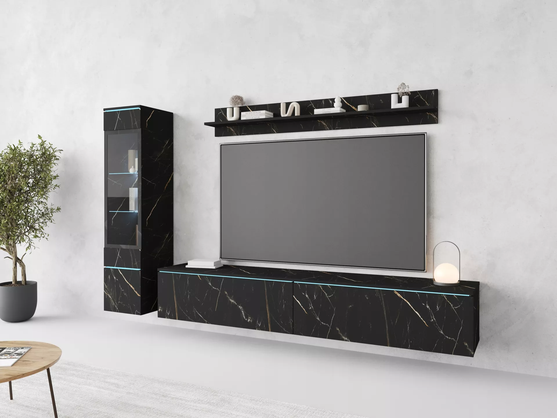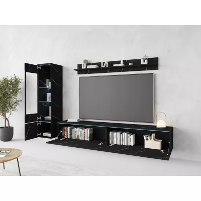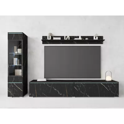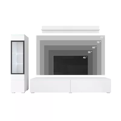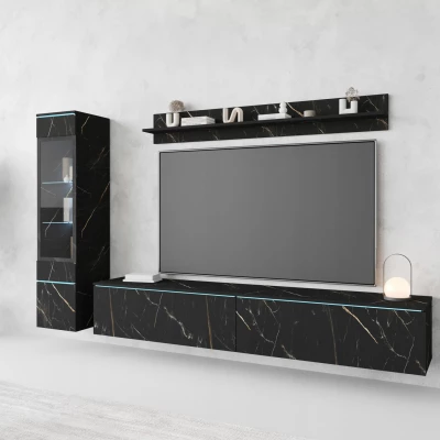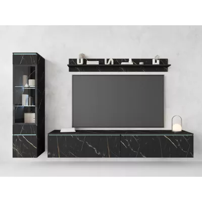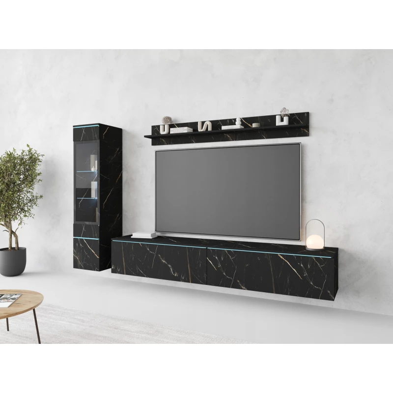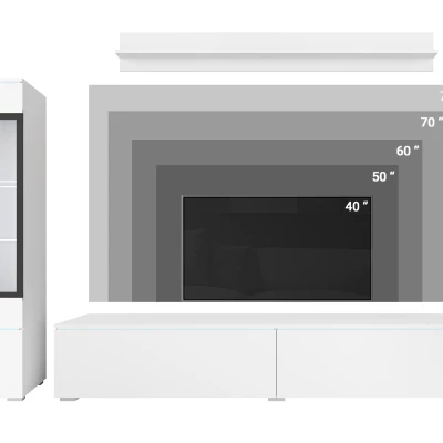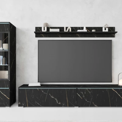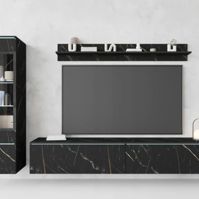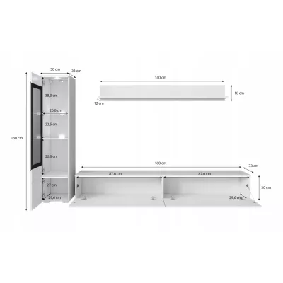 Obývací stěna HERMINA 1 se skládá z vitríny, TV stolku a police. Stěnu můžete zavěsit na zeď nebo postavit na zem.
