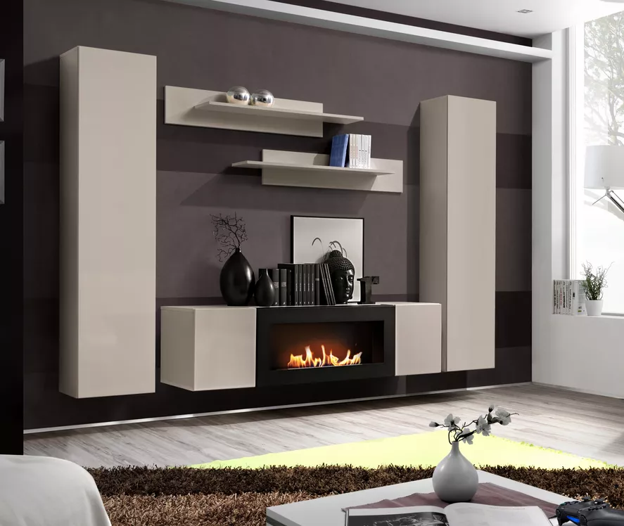 Obýváková stěna FREYA s biokrbem zaujme svým vzhledem. Nábytek lze libovolně kombinovat a vytvářet tak uspořádání přizpůsobená individuálním potřebám a velikosti obývacího pokoje. Sada obsahuje TV stolek, 2 závěsné skříně a 2 police.