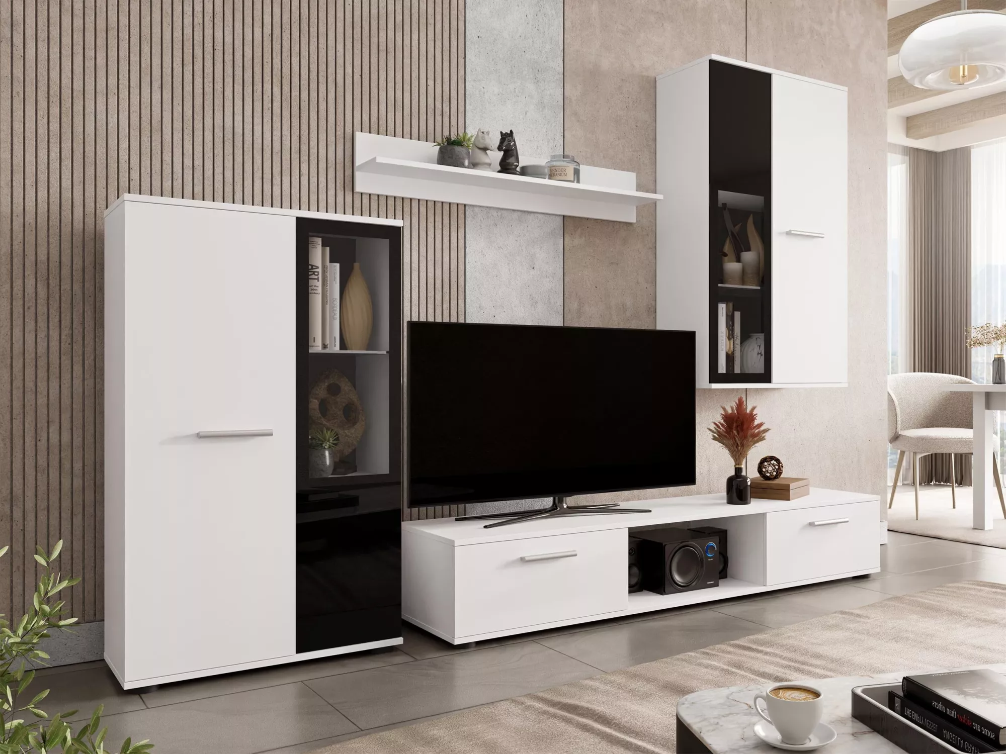 Obývací stěna VENNY bude ideální volbou do vašeho obývacího pokoje. Stěna se skládá z televizního stolku, vitríny, závěsné vitríny a poličky. Disponuje dostatkem úložného prostoru pro vystavení a uložení vašich oblíbených dekorací, suvenýrů nebo dokumentů.