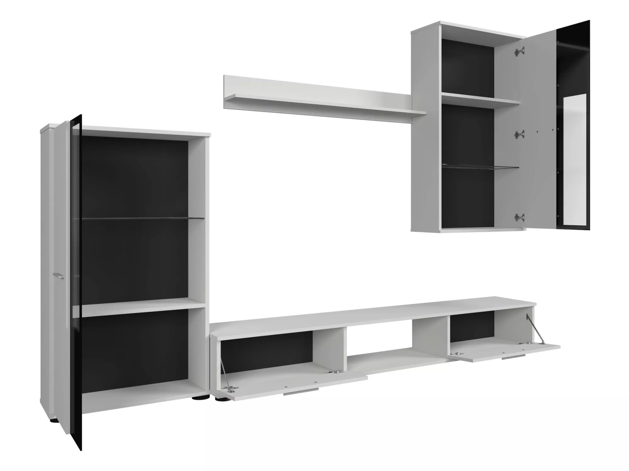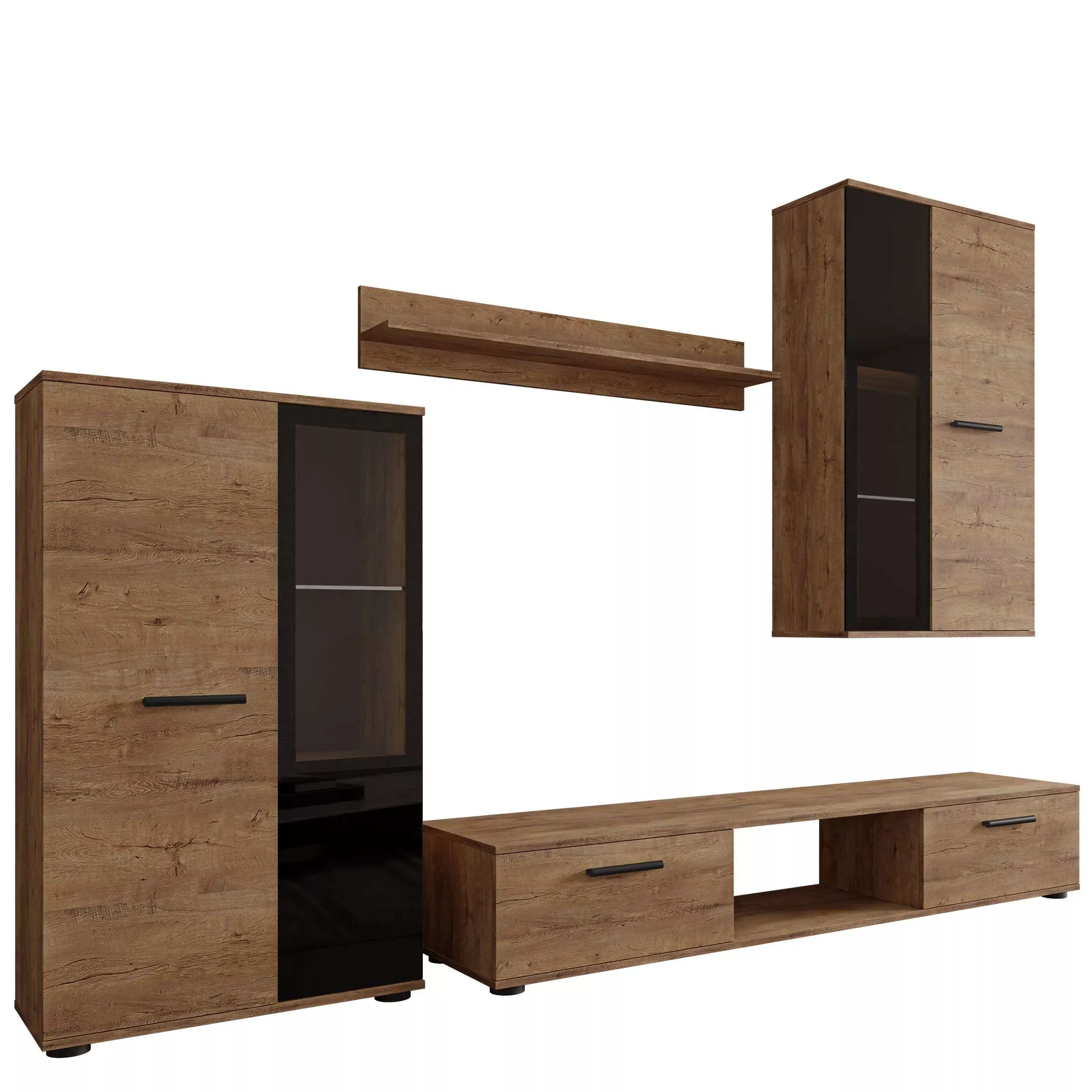 Obývací stěna VENNY bude ideální volbou do vašeho obývacího pokoje. Stěna se skládá z televizního stolku, vitríny, závěsné vitríny a poličky. Disponuje dostatkem úložného prostoru pro vystavení a uložení vašich oblíbených dekorací, suvenýrů nebo dokumentů.