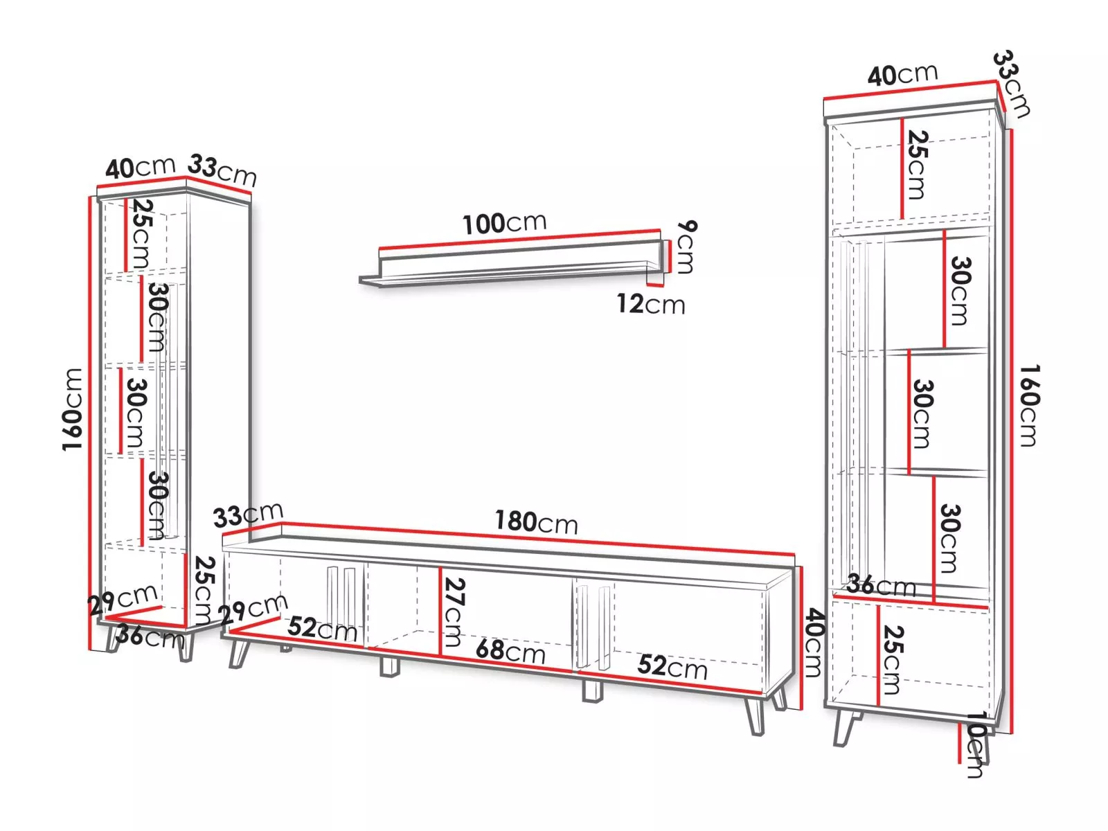 Objevte kouzlo moderního bydlení se stěnou POULSBO 2! Stěna obsahuje vysokou vitrínu, úzký regál s dvířky, závěsnou polici a televizní stolek, které dohromady tvoří promyšlený celek pro útulný obývací prostor. Skleněná dvířka ve vitríně krásně zvýrazní dekorace či porcelán. Černé nohy dodávají celé sestavě vzdušnost a elegantní vzhled.