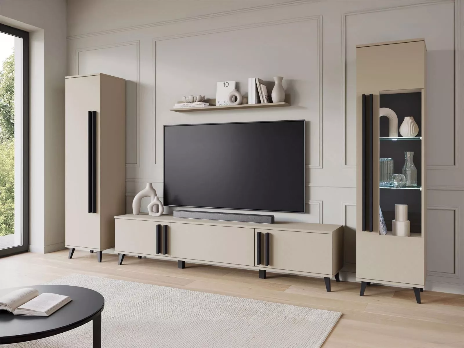 Objevte kouzlo moderního bydlení se stěnou POULSBO 2! Stěna obsahuje vysokou vitrínu, úzký regál s dvířky, závěsnou polici a televizní stolek, které dohromady tvoří promyšlený celek pro útulný obývací prostor. Skleněná dvířka ve vitríně krásně zvýrazní dekorace či porcelán. Černé nohy dodávají celé sestavě vzdušnost a elegantní vzhled.