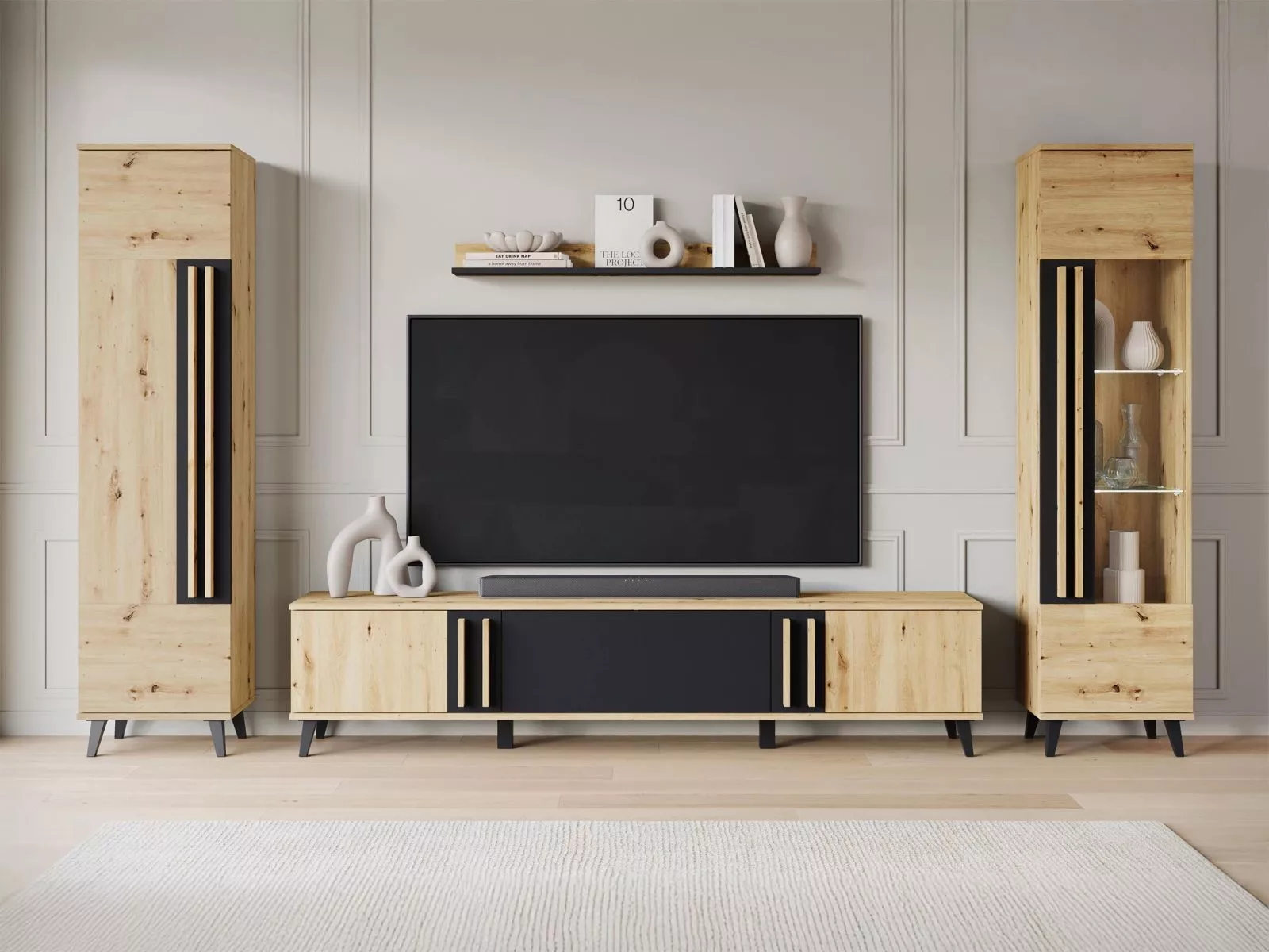 Objevte kouzlo moderního bydlení se stěnou POULSBO 2! Stěna obsahuje vysokou vitrínu, úzký regál s dvířky, závěsnou polici a televizní stolek, které dohromady tvoří promyšlený celek pro útulný obývací prostor. Skleněná dvířka ve vitríně krásně zvýrazní dekorace či porcelán. Černé nohy dodávají celé sestavě vzdušnost a elegantní vzhled.