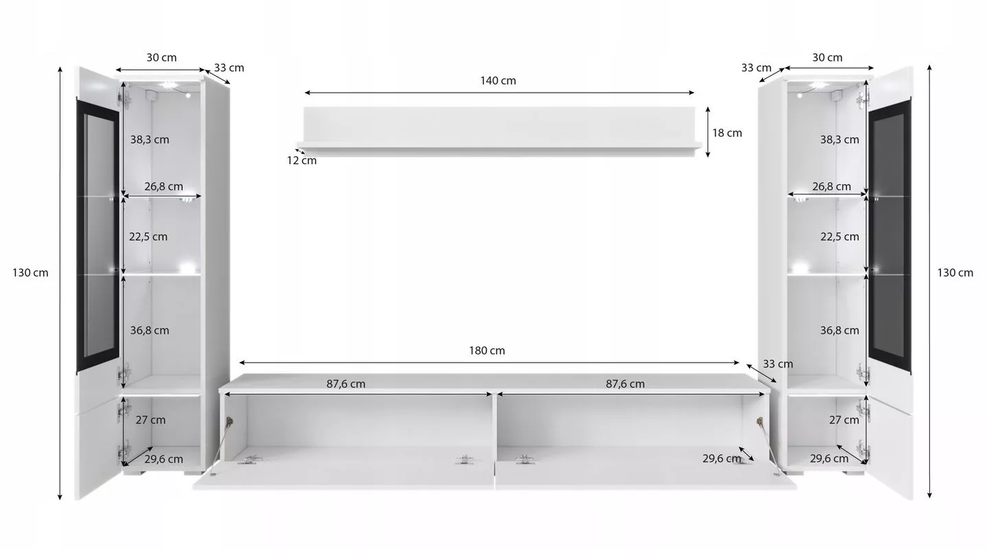 Obývací stěna HERMINA 2 zdůrazní moderní charakter interiéru a poskytne spoustu úložného prostoru. Skládá se ze 2 vitrín, závěsné police a TV skříňky o šířce 180 cm. Stěnu je možné zavěsit i postavit.