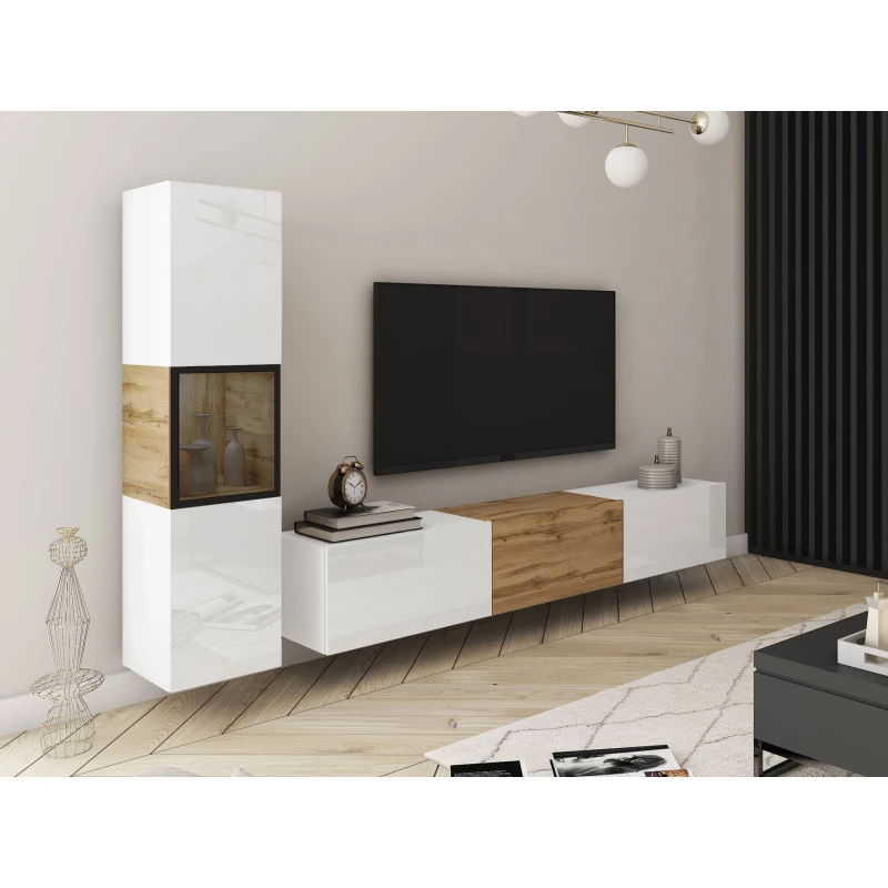 Obývací stěna HEXIO - bílá / bílá lesklá / dub wotan