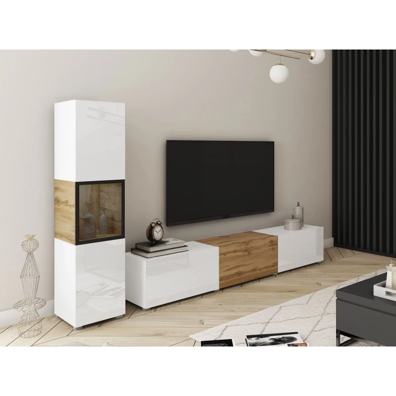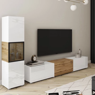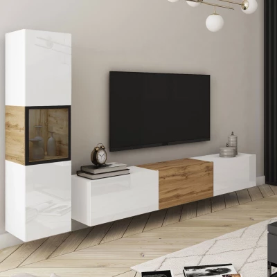 Obývací stěna HEXIO - bílá / bílá lesklá / dub wotan + LED osvětlení