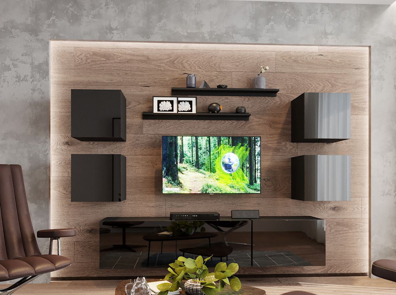 Sada nábytku do obývacího pokoje CHEMUNG 3 odkazuje na současné trendy v interiéru, které kombinují modernost a minimalismus. Prvním prvkem sady je TV stolek o šířce 150 cm, který je vybaven praktickými skříňkami pro úschovu elektronických zařízení nebo jiného příslušenství. Stolek nabízí dva způsoby montáže - na zeď nebo volně stojící. Závěsná vitrína poskytuje další úložný prostor a umožní vystavit dekorativní předměty nebo důležité rodinné památky. Neobvyklé přední části vitríny, vyrobené v lesklém provedení, opticky zvětšují prostor. Hluboké police poskytnou možnost k udržení dokonalého pořádku v obývacím pokoji. Vitrína je vybavená LED modrým osvětlením. Komoda s prostornými uzavřenými policemi je vybavena vložkou z tvrzeného skla, díky které získává originální vzhled. Komoda také disponuje LED modrým osvětlením. Posledním prvkem sady je nástěnná uzavřená police, která poskytuje prostor pro knihy, hračky, osobní věci nebo dekorace.